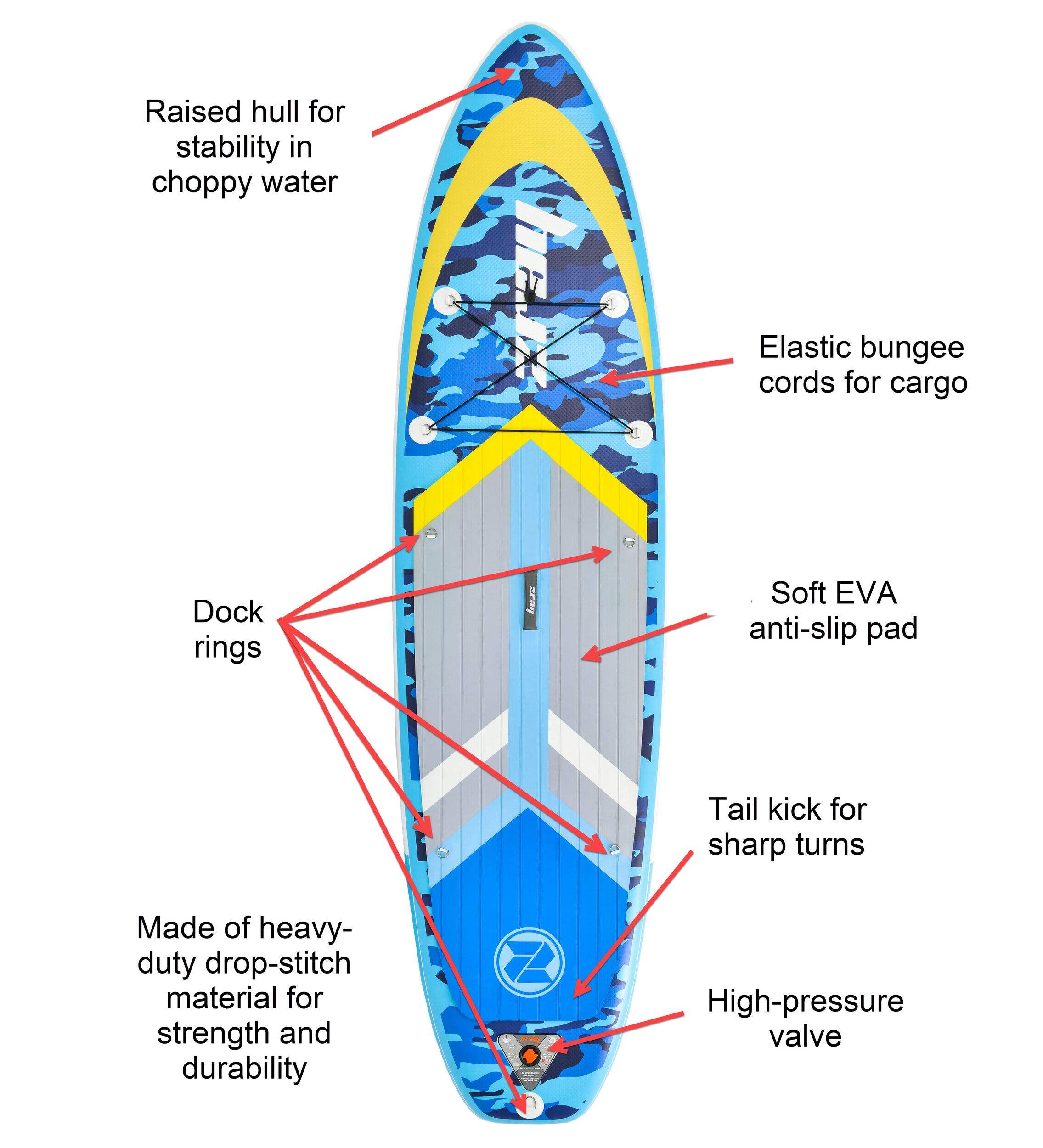 Camo-printed EVA foam deck pad provides a soft, anti-slip surface for hours of comfortable paddling