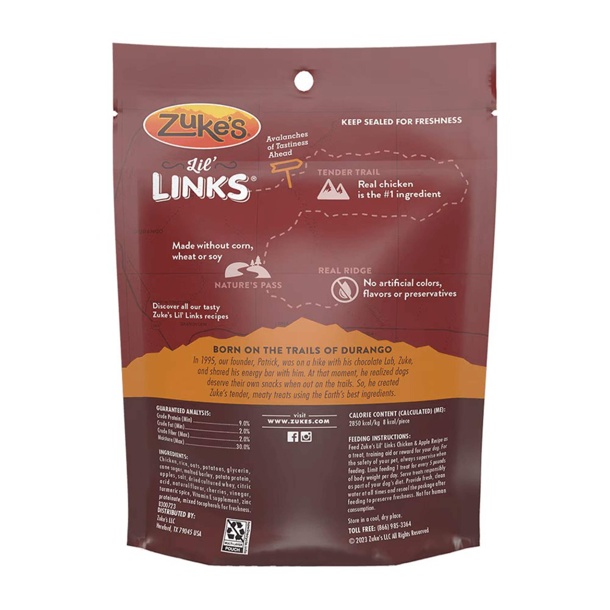 Zuke’s Lil’ Links Dog Treats Chicken and Apple Recipe deliver sausage-shaped treats packed with high quality protein and simple ingredients. These natural, with added vitamins and minerals dog treats deliver a soft and chewy texture and are great for training or rewarding. Zuke’s Lil’ Links come in a resealable pouch for your convenience and are great for dogs of all breeds and sizes.