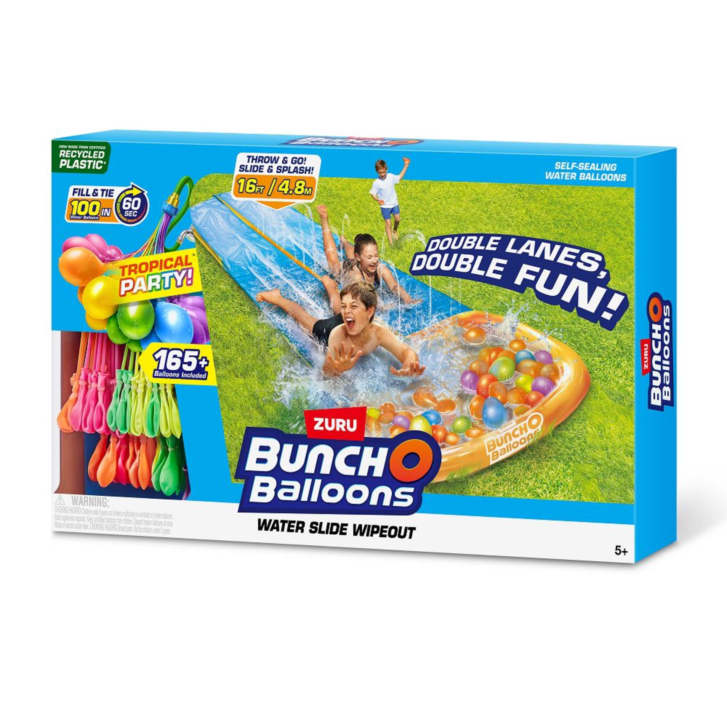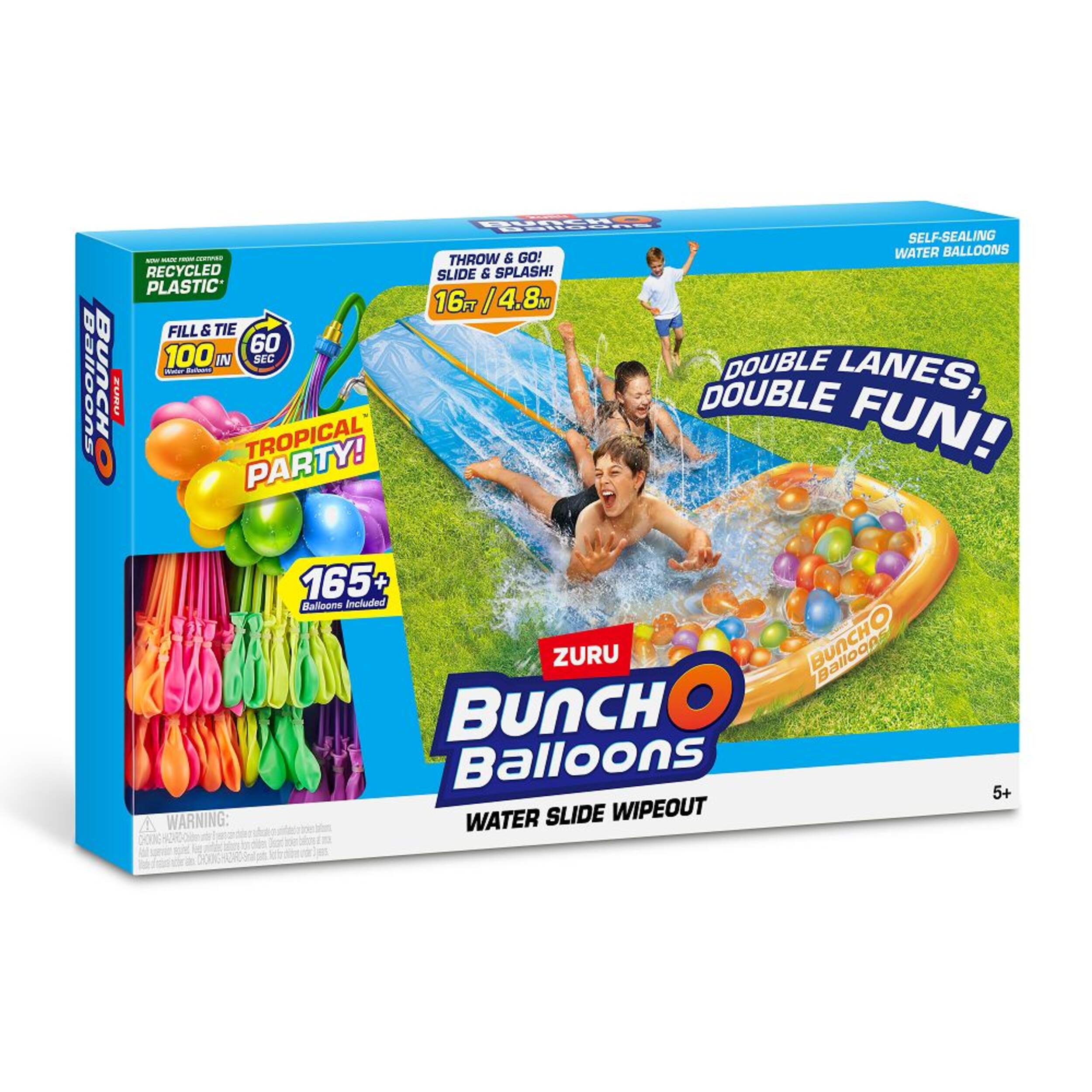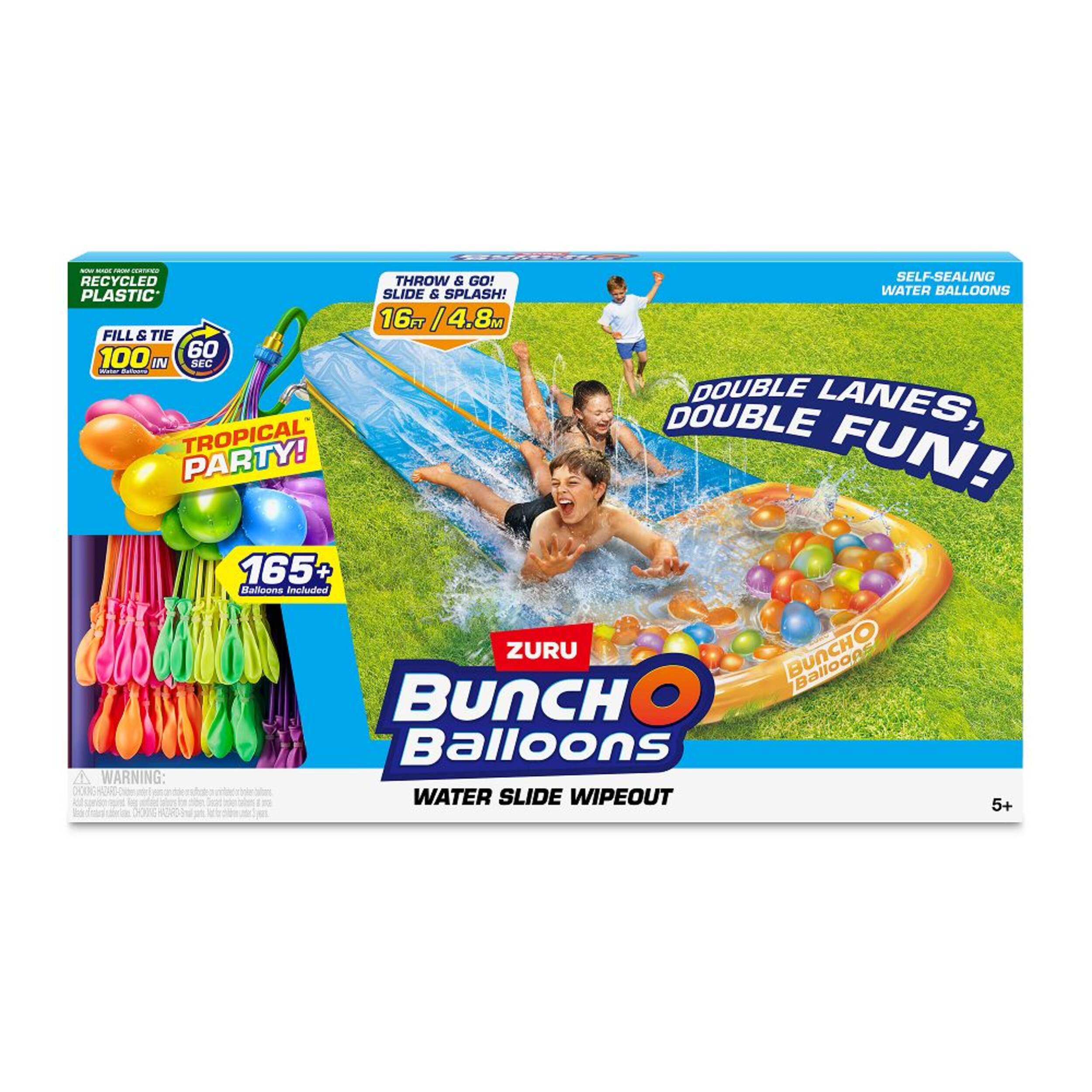 Get ready for some tropical party fun this summer with the Zuru Bunch-O-Balloons Double Lane Tropical Party Water Slide. This exciting water slide features two slippery lanes, so you and a friend can race to the bottom. Fill up and tie the easy connect Bunch-O-Balloons, then watch them cascade down the slide. With its bright tropical graphics, this Bunch-O-Balloons water slide adds a splash of fun and excitement to any outdoor party or barbecue. Kids ages 6 and up will love racing down the lanes of this durable nylon slide. Bring on the summer fun with this tropically-themed dual water slide from Zuru!