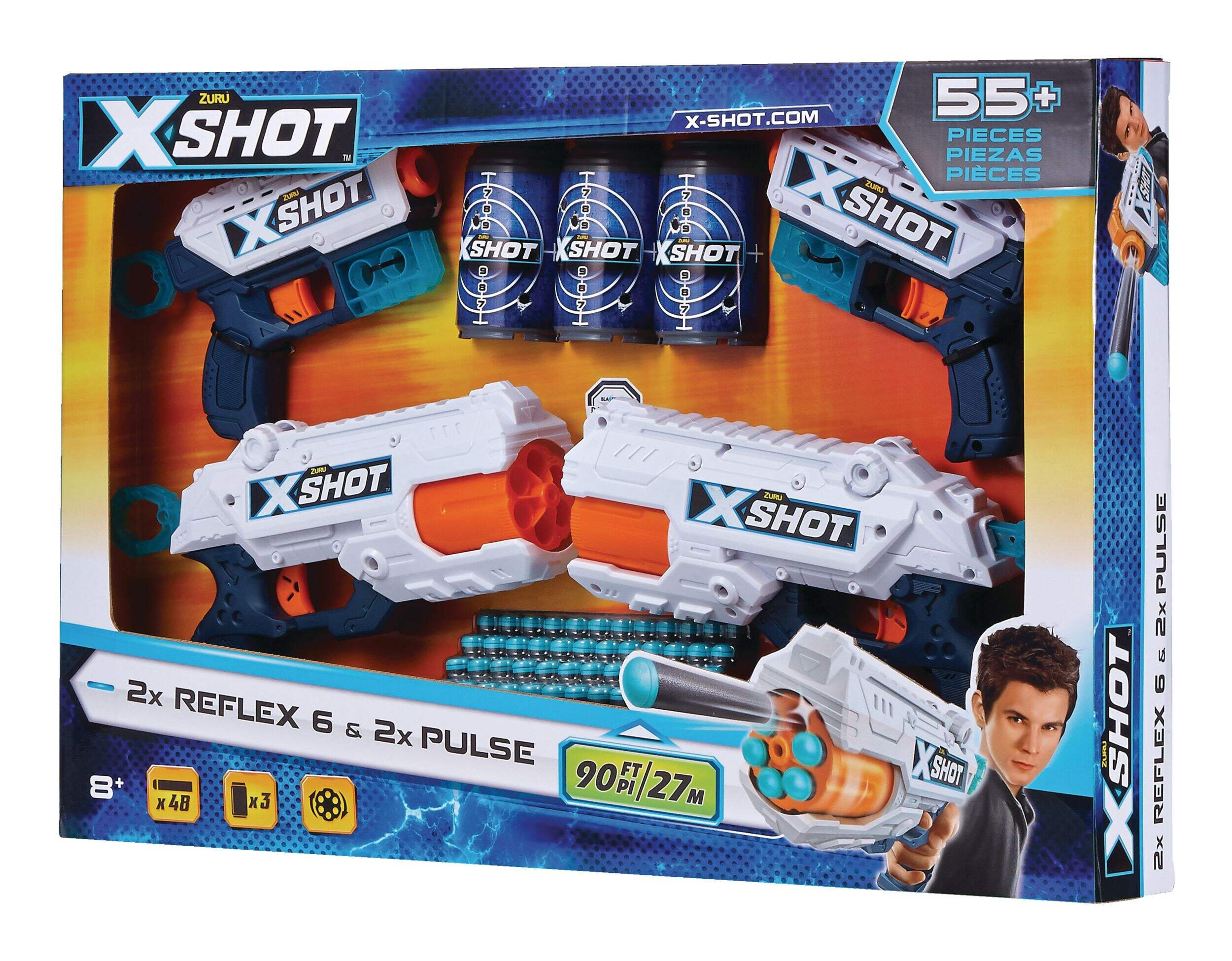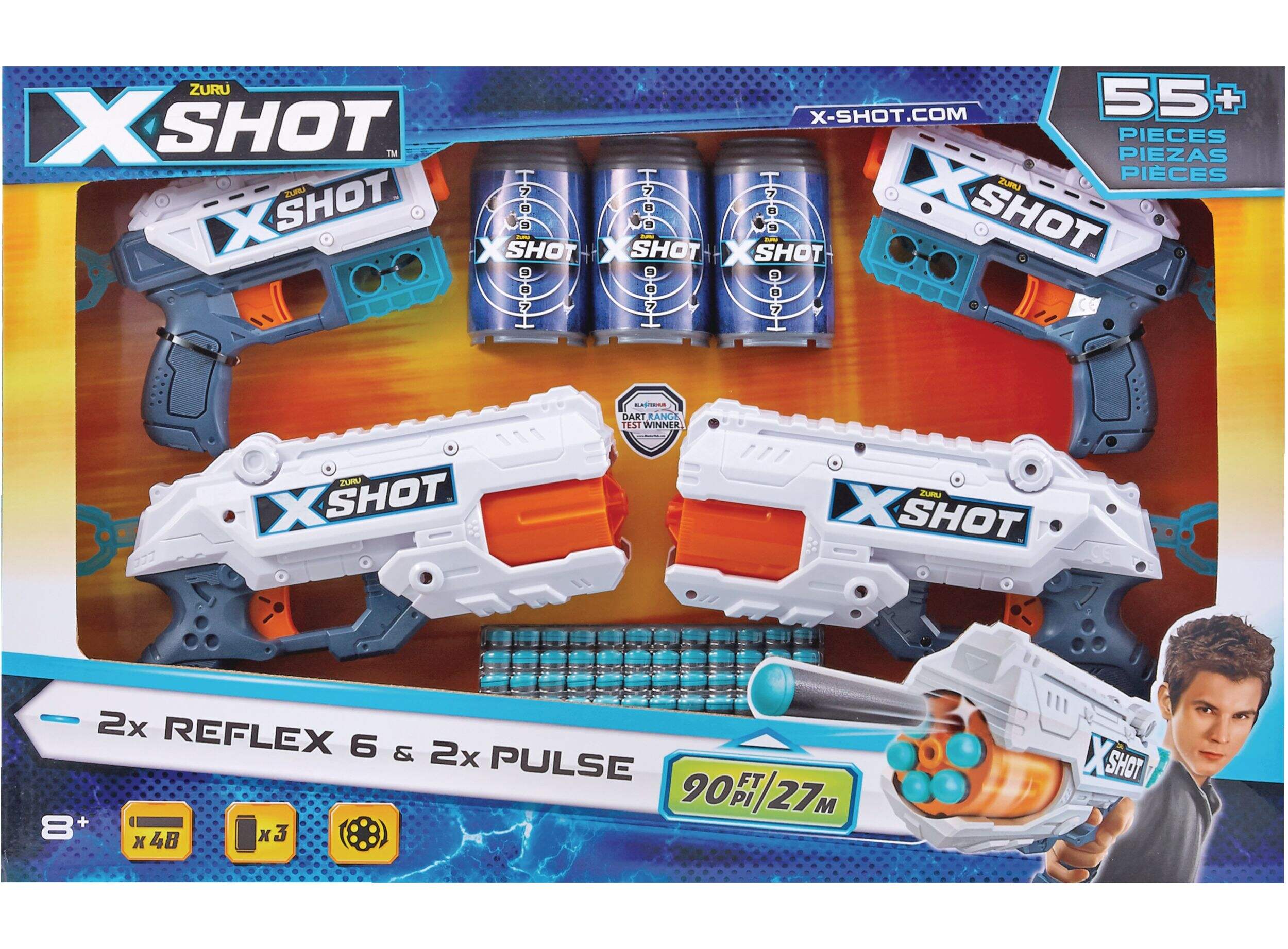 Includes 2 X-Shot Kickback, 2 X-Shot Reflex 6, 3 Cans, and 48 Darts