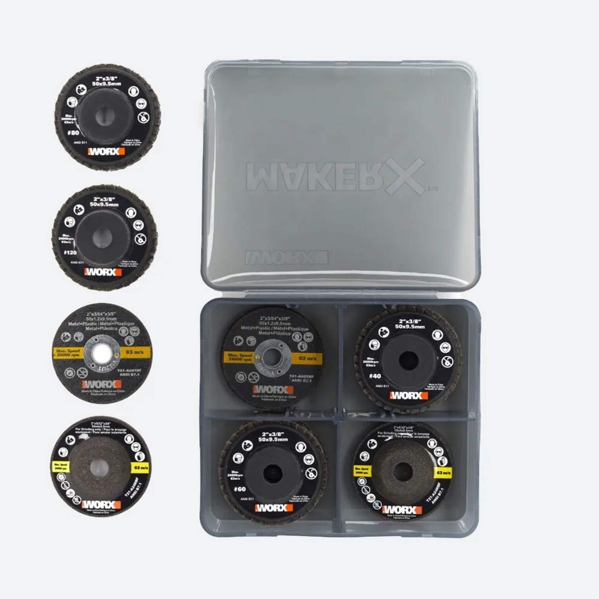 Accessoires pour meuleuse d'angle WORX MakerX de petit format qui comprend les accessoires nécessaires pour le meulage et la coupe du métal ou le sablage du bois et du métal