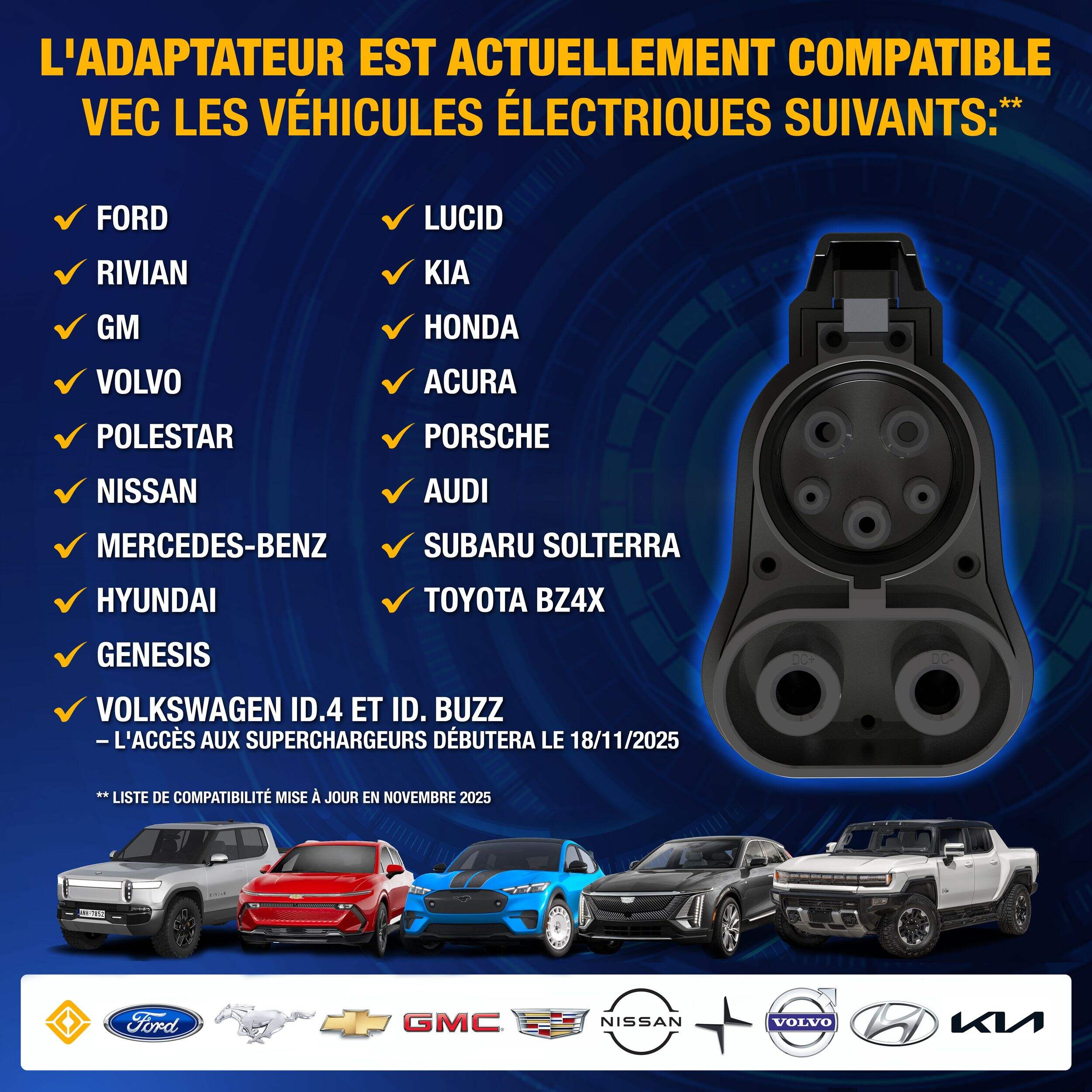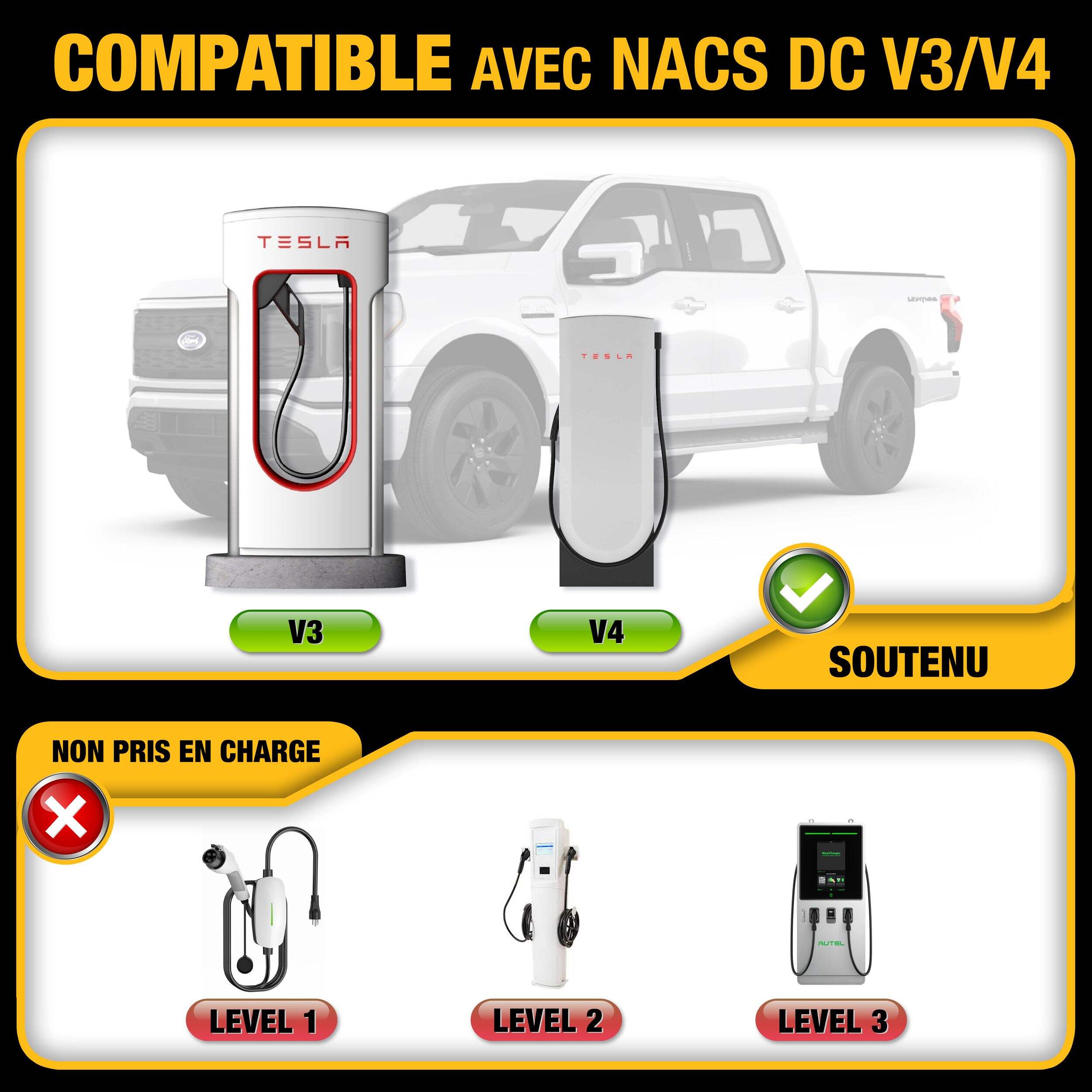 Compatible avec les superchargeurs Tesla V3/V4, Rivian R1T/S, Ford Mach-E et F-150 Lightning, les véhicules électriques GM (Bolt, Silverado EV, Hummer EV, Equinox EV, Blazer EV, Lyriq), Polestar, Volvo, Nissan Arya,Hyundai Ioniq 5/6 et Kona, Kia EV modèles 3, 6 et 9