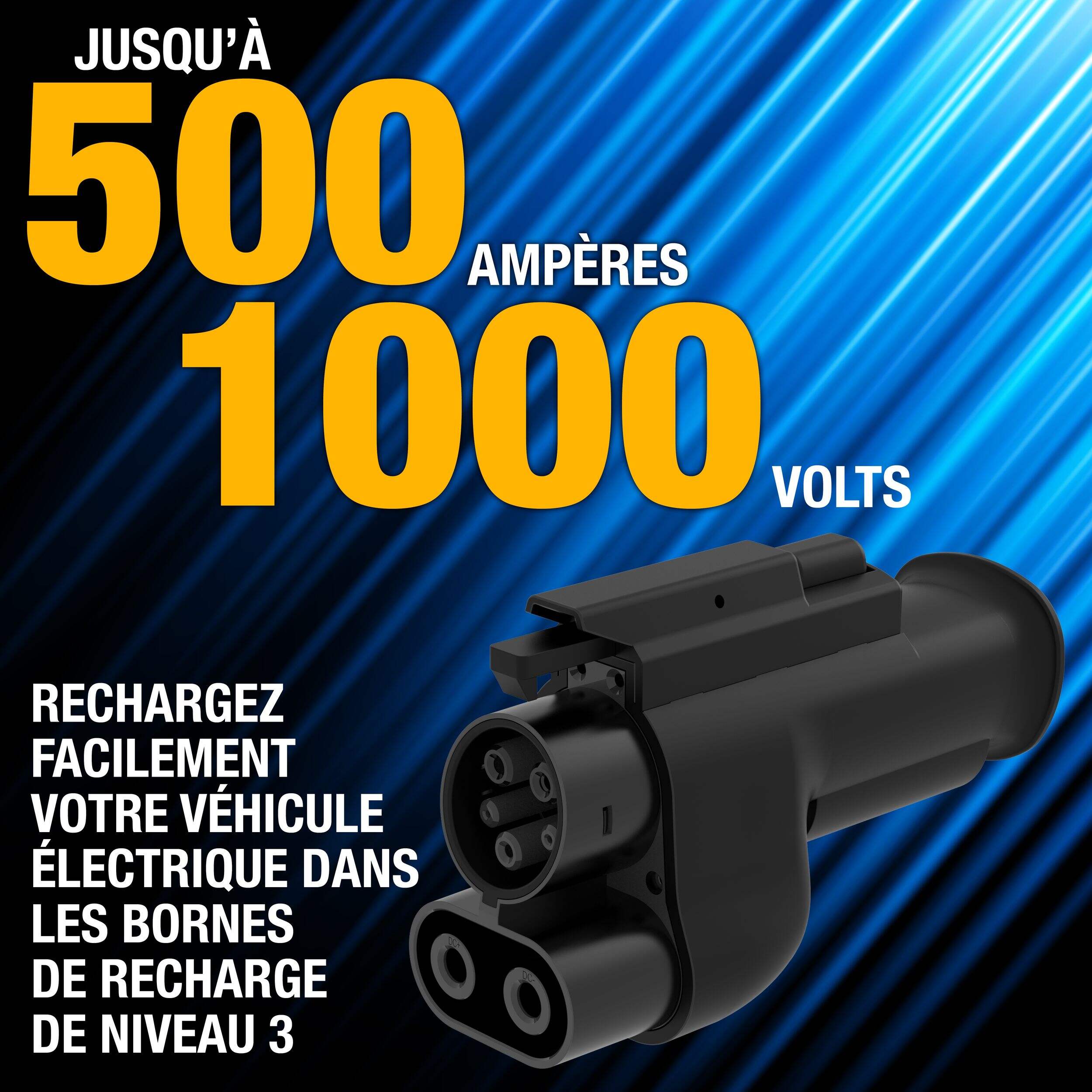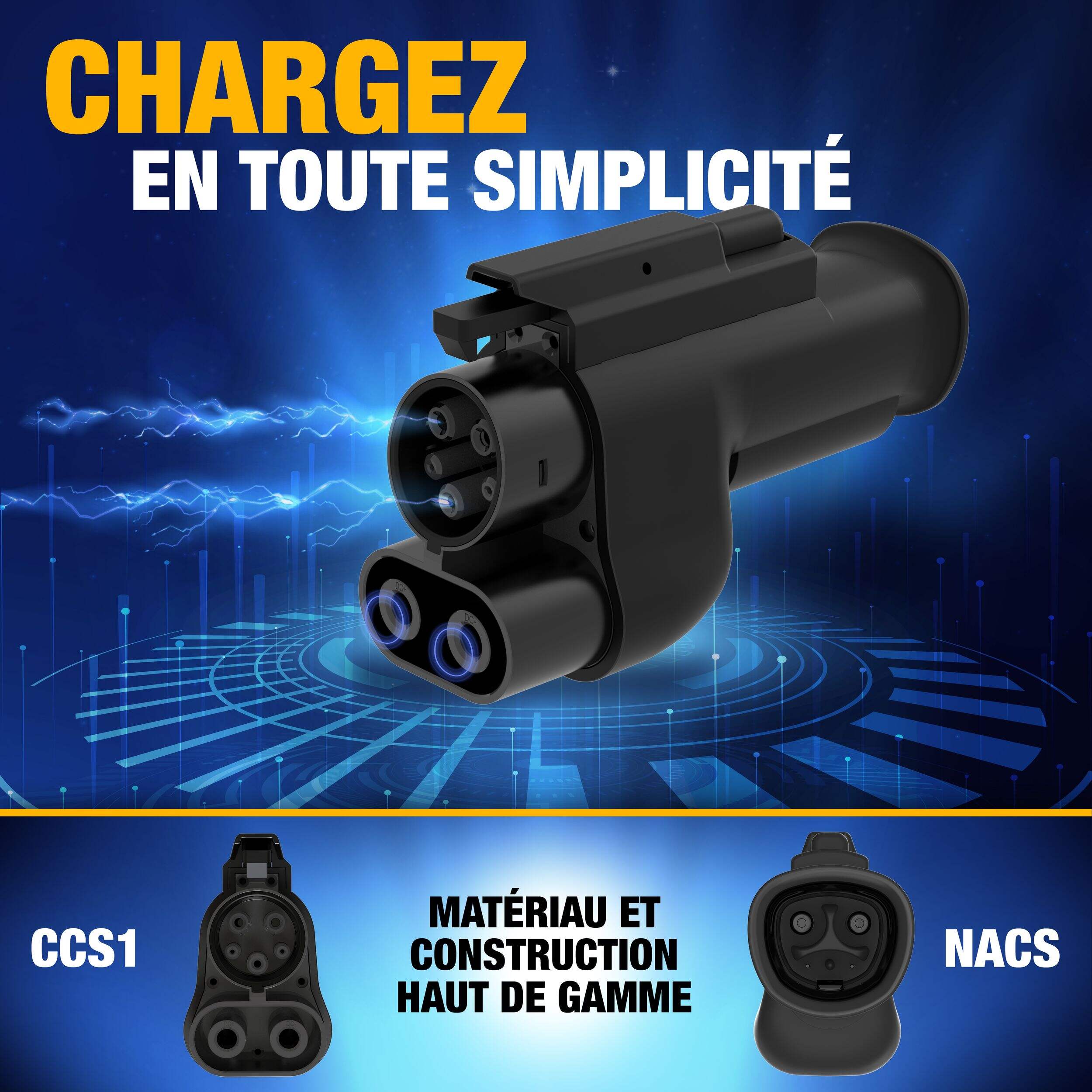 Recharge facile. L'adaptateur de charge rapide CCS1 vers NACS est la solution ultime pour connecter les véhicules électriques Tesla aux bornes de recharge rapide CCS de fournisseurs tiers. Désormais, les propriétaires des Tesla Model S, 3, X et Y de 2021 et plus récents peuvent profiter de la commodité et de la polyvalence offertes par l'utilisation de 20 000 bornes de recharge de fournisseurs tiers partout en Amérique du Nord. Plus aucune limite, une recharge sans tracas. Puisqu'il prend en charge jusqu'à 350 A/1000 V, rechargez rapidement et facilement votre VÉ sans perte de vitesse de charge. Fabriqué avec des matériaux durables de haute qualité, cet adaptateur est conçu pour résister aux exigences d'une utilisation quotidienne. L'adaptateur est conforme à la norme IP54 et peut résister à des températures de fonctionnement allant de -22 °F à +122 °F. il suffit de brancher l'adaptateur à votre chargeur, et vous êtes prêt à l'utiliser. (chargeur pour VÉ vendu séparément) Sac de rangement inclus pour une recharge pratique sur la route. Garanti robuste, nous accompagnons notre article d'une garantie limitée de 3 ans et d'un soutien technique à la clientèle 24 heures sur 24, 7 jours sur 7.