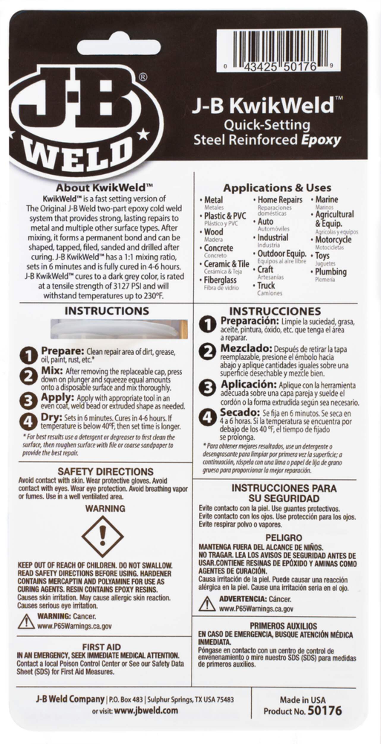 KwikWeldMC est une version à durcissement rapide du système de soudure à froid à l'époxy à deux éléments de JB Weld original qui permet d'effectuer des réparations robustes et durables sur le métal et sur de nombreux autres types de surfaces. Une fois mélangé, il crée un joint permanent pouvant être sculpté, taraudé, rempli, poncé et percé après le séchage. Ce produit a un rapport de mélange de 1:1, durcit au toucher en 6 minutes et durcit complètement en 4 à 6 heures. Il a une couleur gris foncé lorsque durcit, a une résistance à la traction de 3 127 lb/po2 et résiste à des températures allant jusqu'à 300 °F.