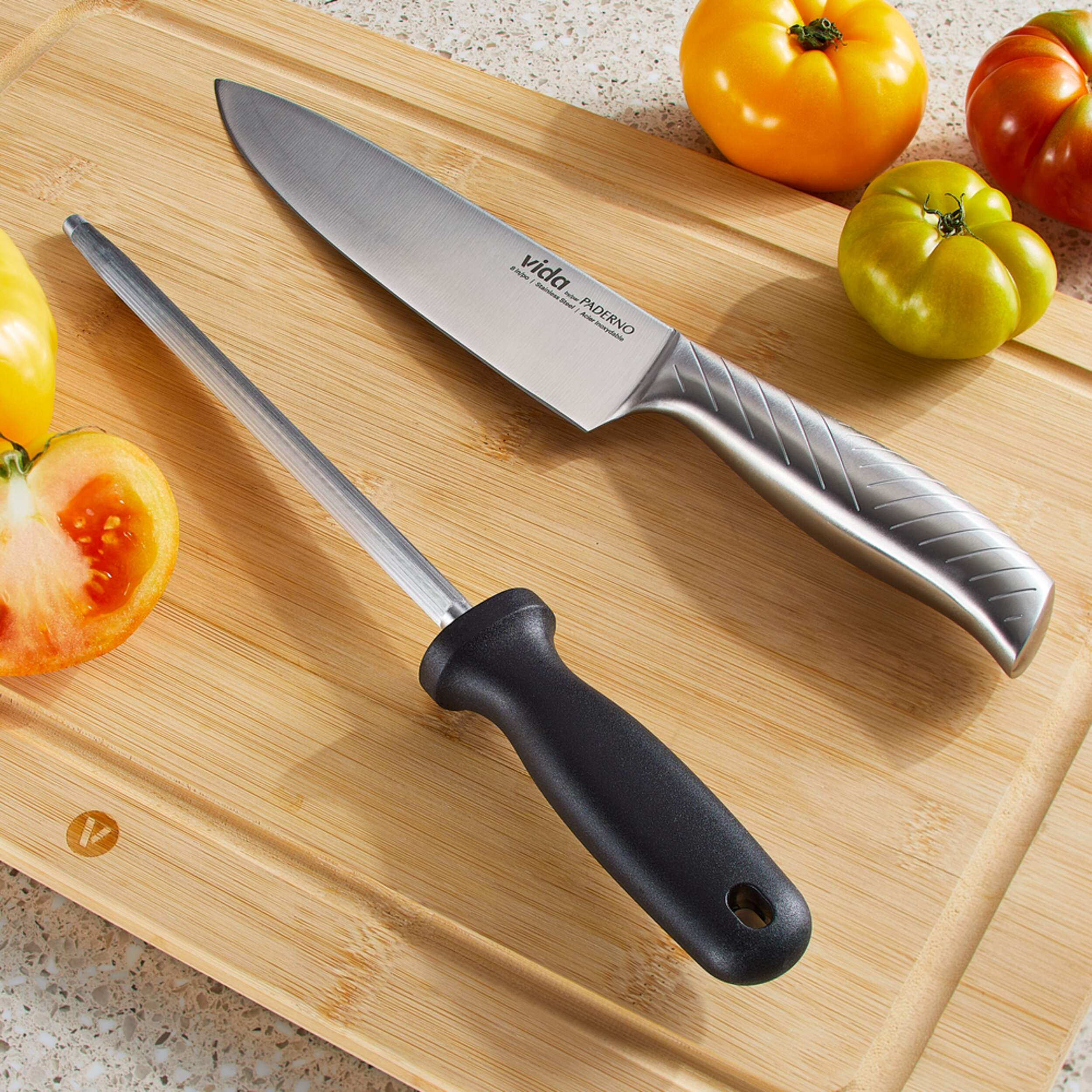Prolongez la durée de vie de votre collection de couteaux avec le fusil à aiguiser Vida par PADERNO. Conçu pour renforcer et aligner les fibres métalliques, ce fusil à aiguiser est un moyen rapide et facile de restaurer les lames émoussées. Cet outil d'affûtage pour couteaux est fait d'acier au carbone de qualité supérieure et est doté d'une base antiadhésive en aluminium forgé pour une distribution rapide et uniforme de la chaleur. Doté d'une prise profilée confortable, cet outil d'affûtage de couteaux manuel est un moyen facile de garder vos couteaux tranchants.