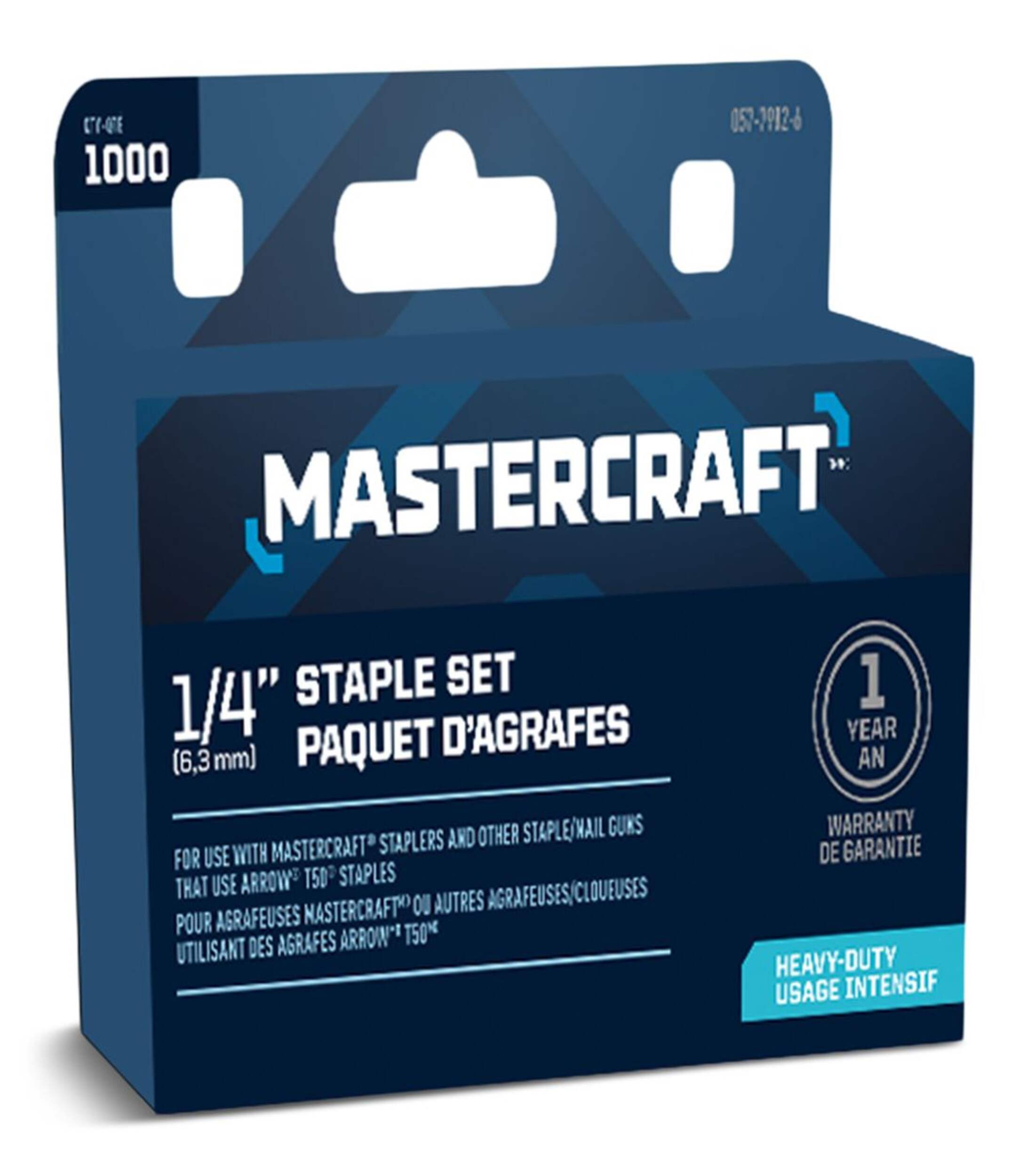 Les agrafes T50 galvanisées Mastercraft, 1/4 po, offrent une fixation robuste pour une multitude de projets. Vendues en paquets de 1000 pour plus de commodité, ces agrafes galvanisées robustes de haute qualité sont conçues pour durer longtemps. Ces agrafes doivent être utilisées avec les agrafeuses Mastercraft utilisant des agrafes galvanisées Arrow T50. Garantie d'un an comprise.