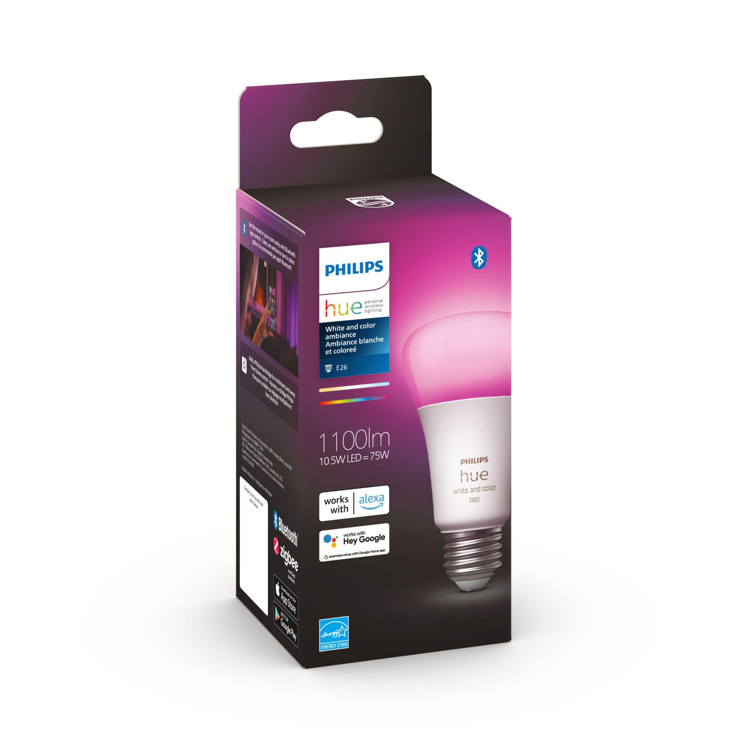 Transformez n'importe quelle pièce avec l'ampoule à DEL intelligente Philips Hue A19. Choisissez parmi 16 millions de couleurs, synchronisez-la avec de la musique ou des films, ou réveillez-vous avec un doux effet de lever du soleil avec cette ampoule polyvalente. Compatible avec les appareils Apple HomeKit et Google Home pour une commande vocale facile, elle crée une expérience d'éclairage connecté. Jumelez cette ampoule avec le pont Hue de Philips pour un contrôle complet à partir de votre téléphone intelligent ou de votre tablette.