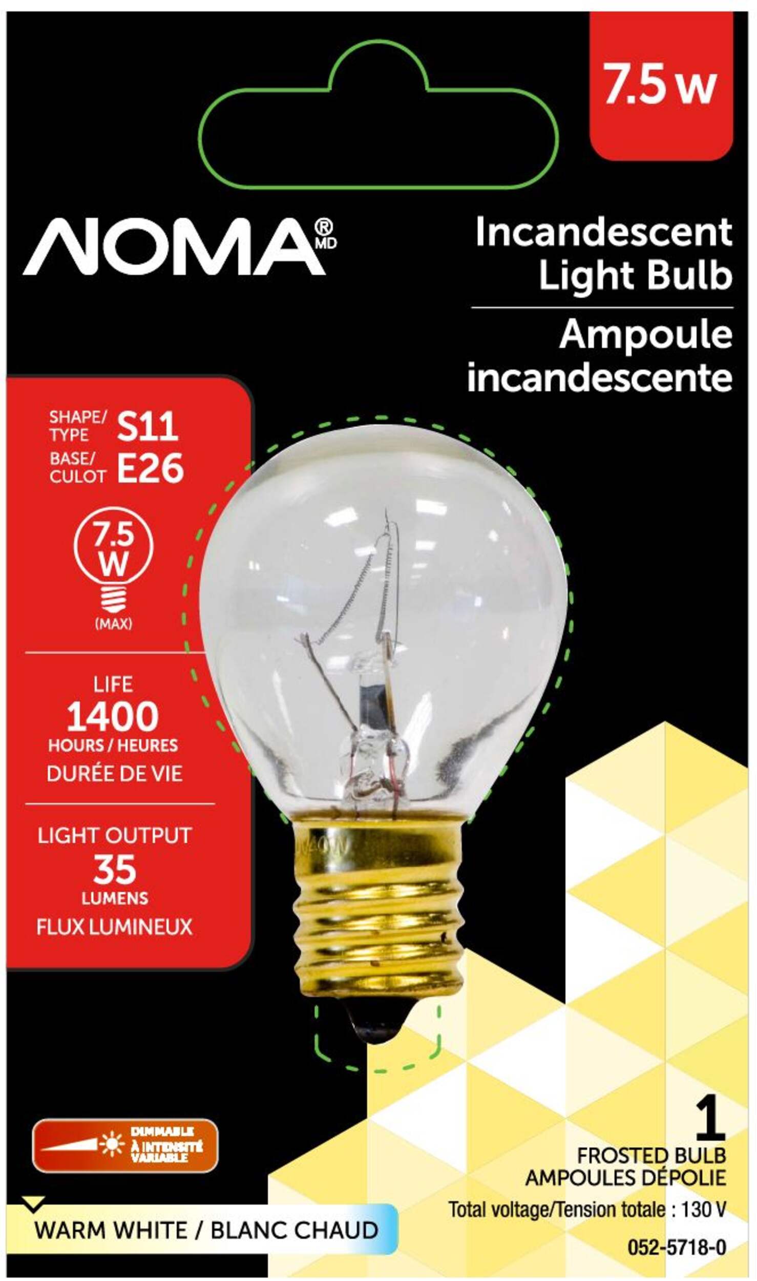 Conçue avec une forme de type S11 et un culot E26, l'ampoule incandescente givrée à intensité variable NOMA S11 à culot E26 de 7,5 W est idéale pour les utilisations intérieures, y compris l'éclairage d'étagères ou de tableaux et les lampes de table ou de bureau et les veilleuses. Ampoule incandescente produisant 35 lumens d'éclairage tout en consommant seulement 7,5 watts de puissance. Avec une lumière givrée blanc chaud et à intensité variable, cette ampoule de 7,5 W offre jusqu'à 1 400 heures d'éclairage avant de nécessiter un remplacement.