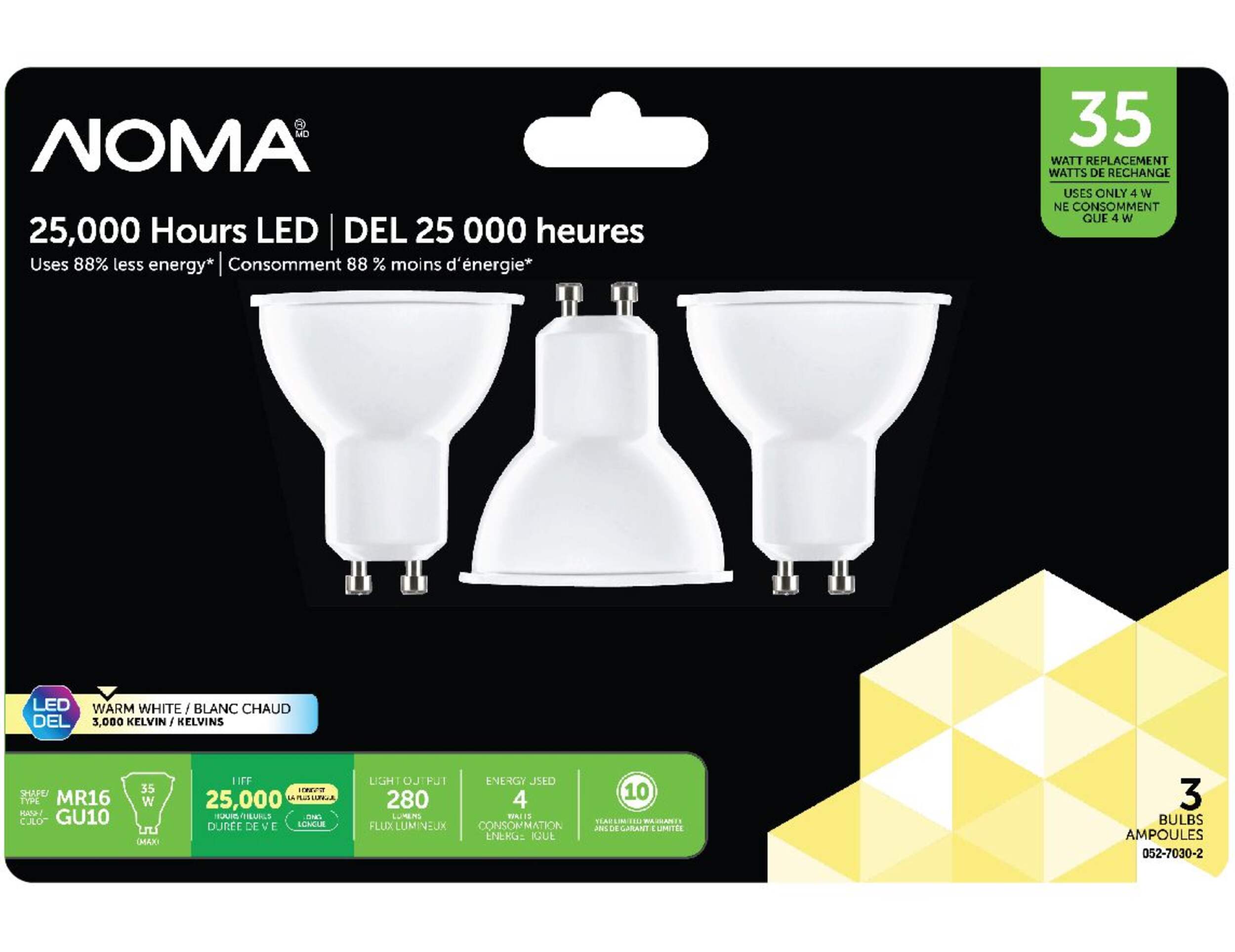 Les ampoules à DEL GU10 35W de NOMA produisent 280 lm de lumière et durent jusqu'à 25 000 heures.