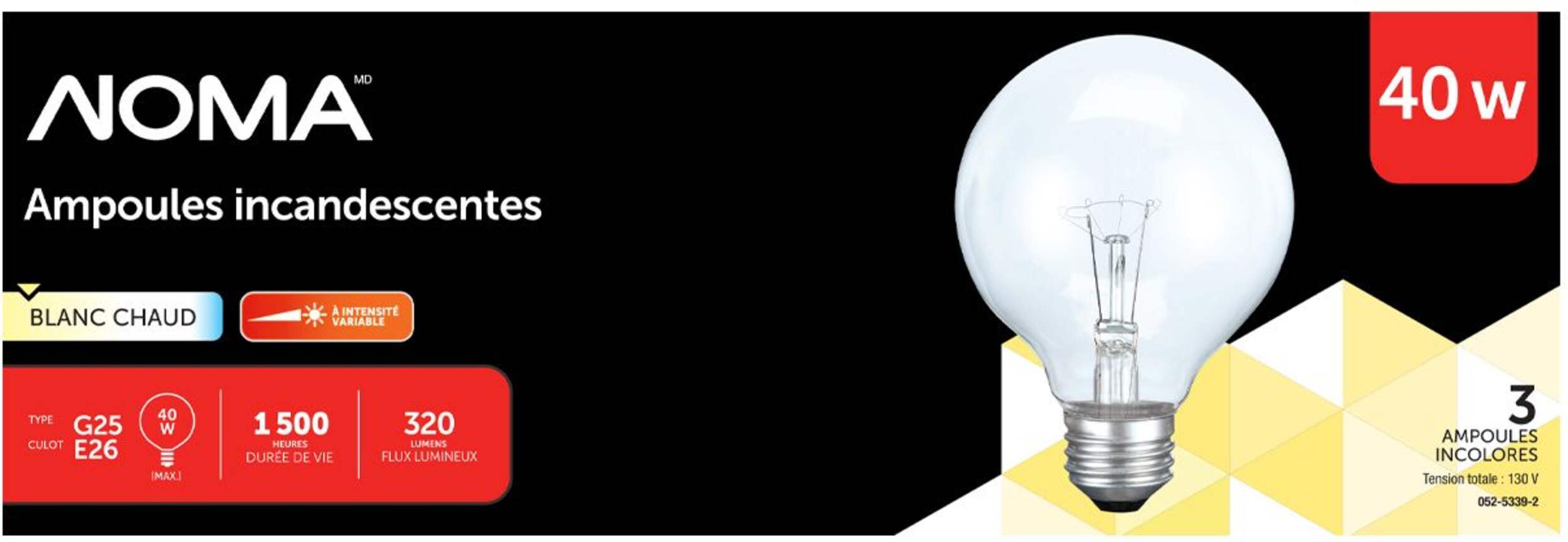 Ampoules incandescentes de longue durée NOMA G25 de 40 W de forme ronde décorative idéale pour illuminer les luminaires suspendus et de vanités