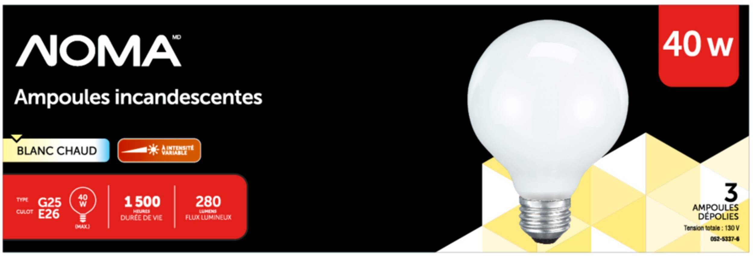 Conçues pour être utilisées avec des appliques de salle de bain et des luminaires suspendus, les ampoules incandescentes de longue durée NOMA G25 de 40 W fournissent 320 lumens de lumière pour éclairer votre espace jusqu'à 3 000 heures. Ampoule incandescente offrant une lumière douce et claire de 2 500 K et disposant d'une forme de type G25 et d'un culot moyen pour une polyvalence remarquable dans une grande variété de luminaires. Lumière blanc doux offrant une luminosité confortable dans votre cuisine ou votre salle de bain. Paquet de 3 ampoules.