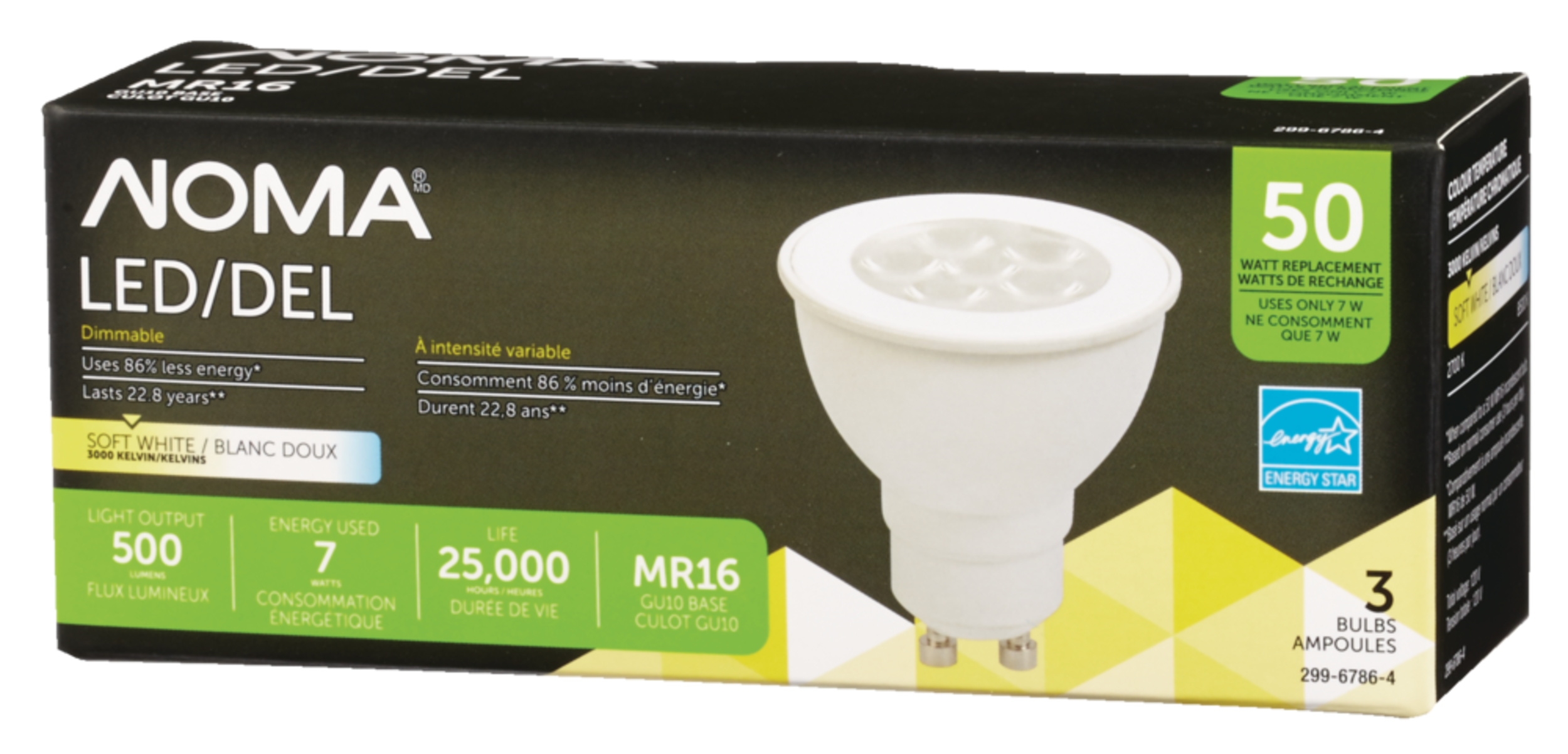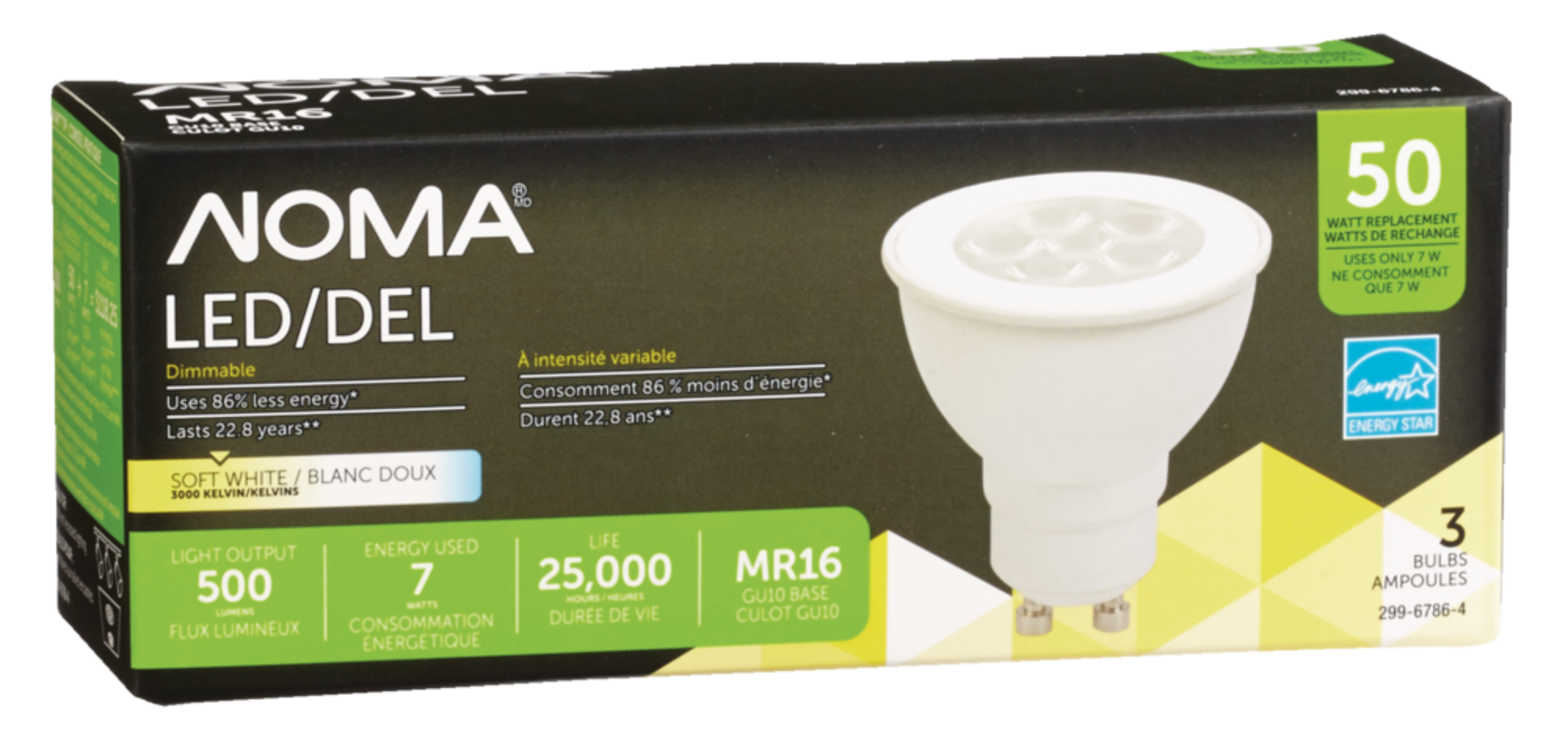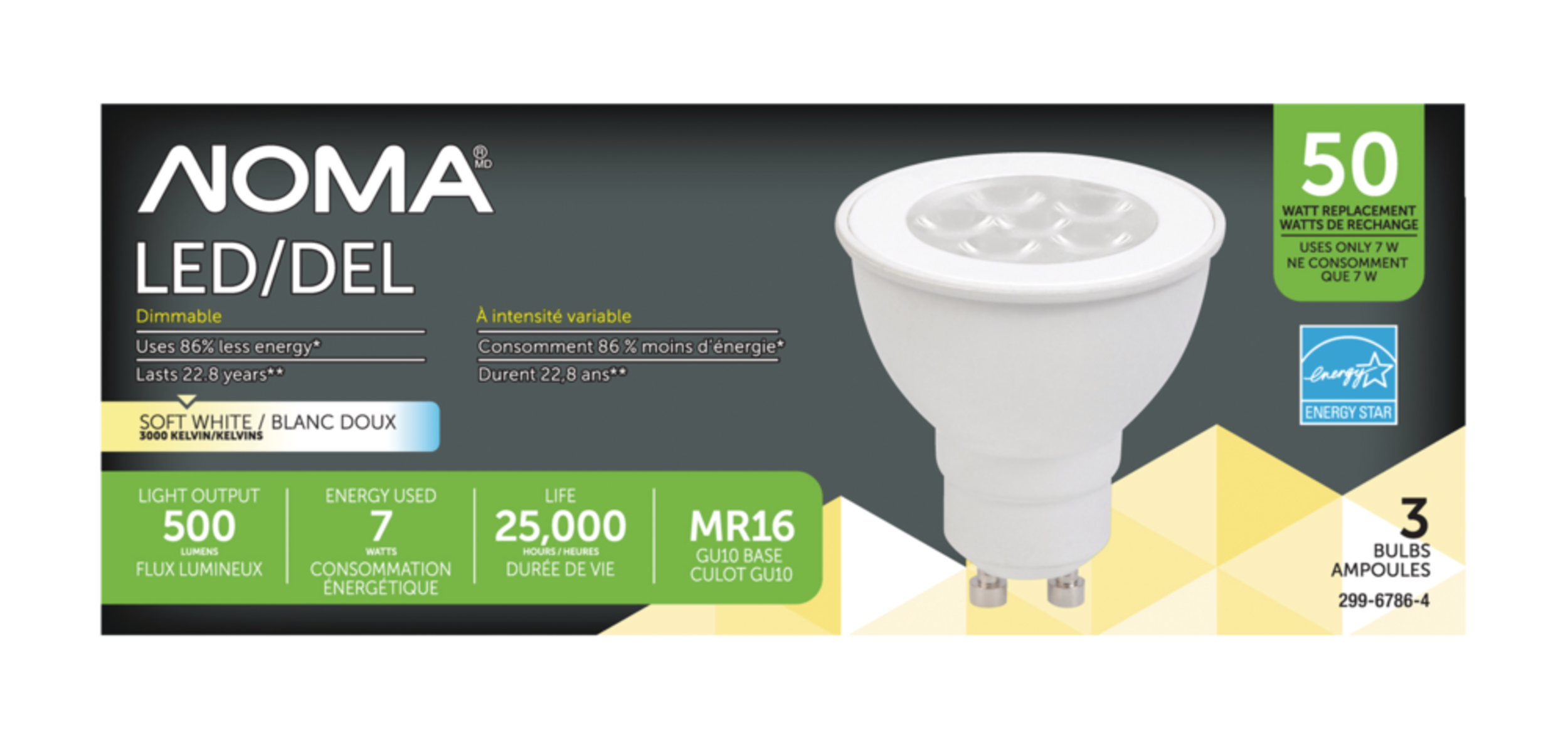 Consommant 86 % moins d'énergie que les autres ampoules, l'ampoule à DEL NOMA GU10 a une équivalence de puissance de 50 W et une durée de vie allant jusqu'à 25 000 heures, ce qui vous permet d'éclairer votre espace avec une lumière blanc doux pendant des années avant de nécessité un remplacement. Ampoule à DEL durable et écoénergétique homologuée ENERGY STARsupMDsup et qui convient à une utilisation domestique à l'intérieur. Ampoule à DEL à intensité variable compatible avec les gradateurs pour un contrôle précis de l'éclairage.