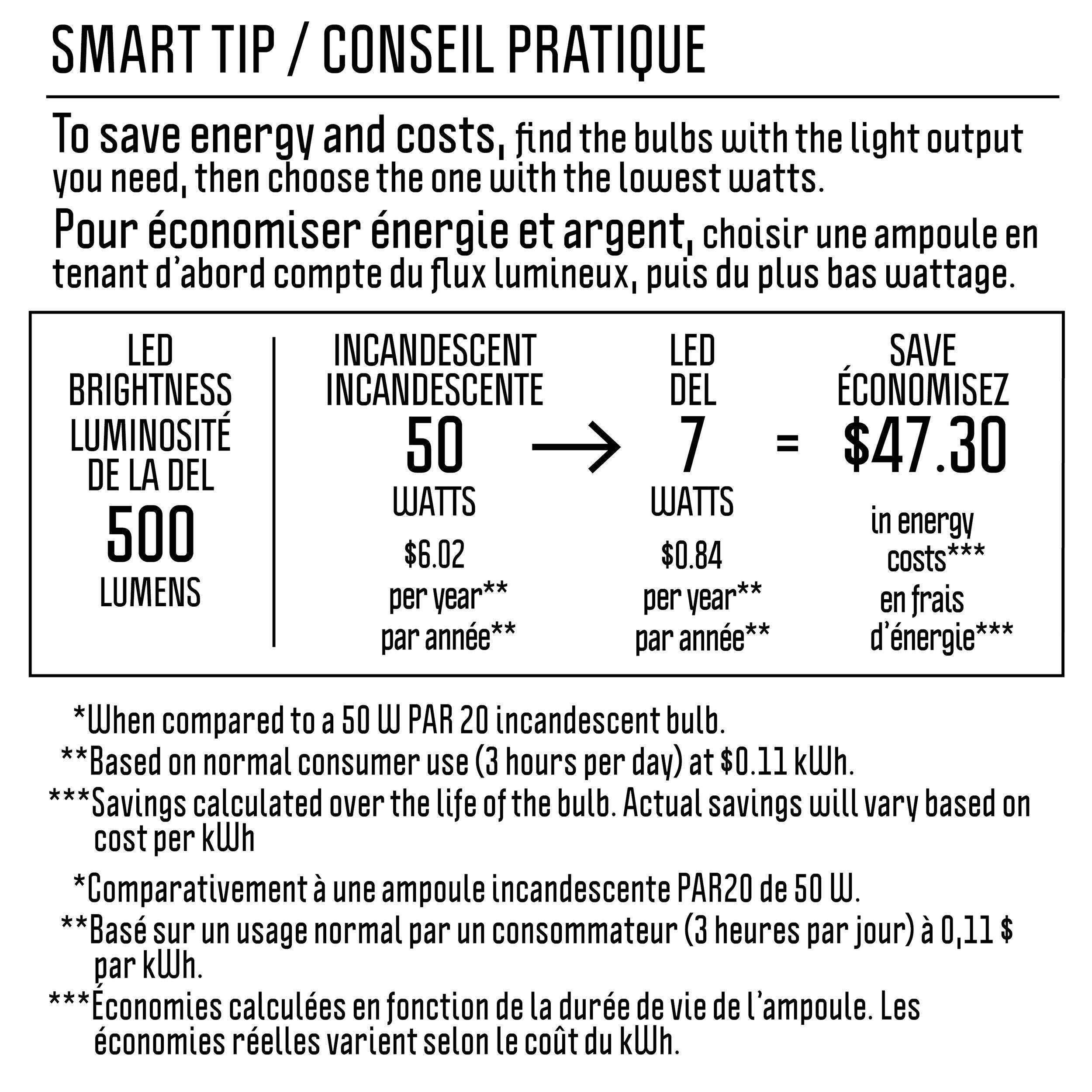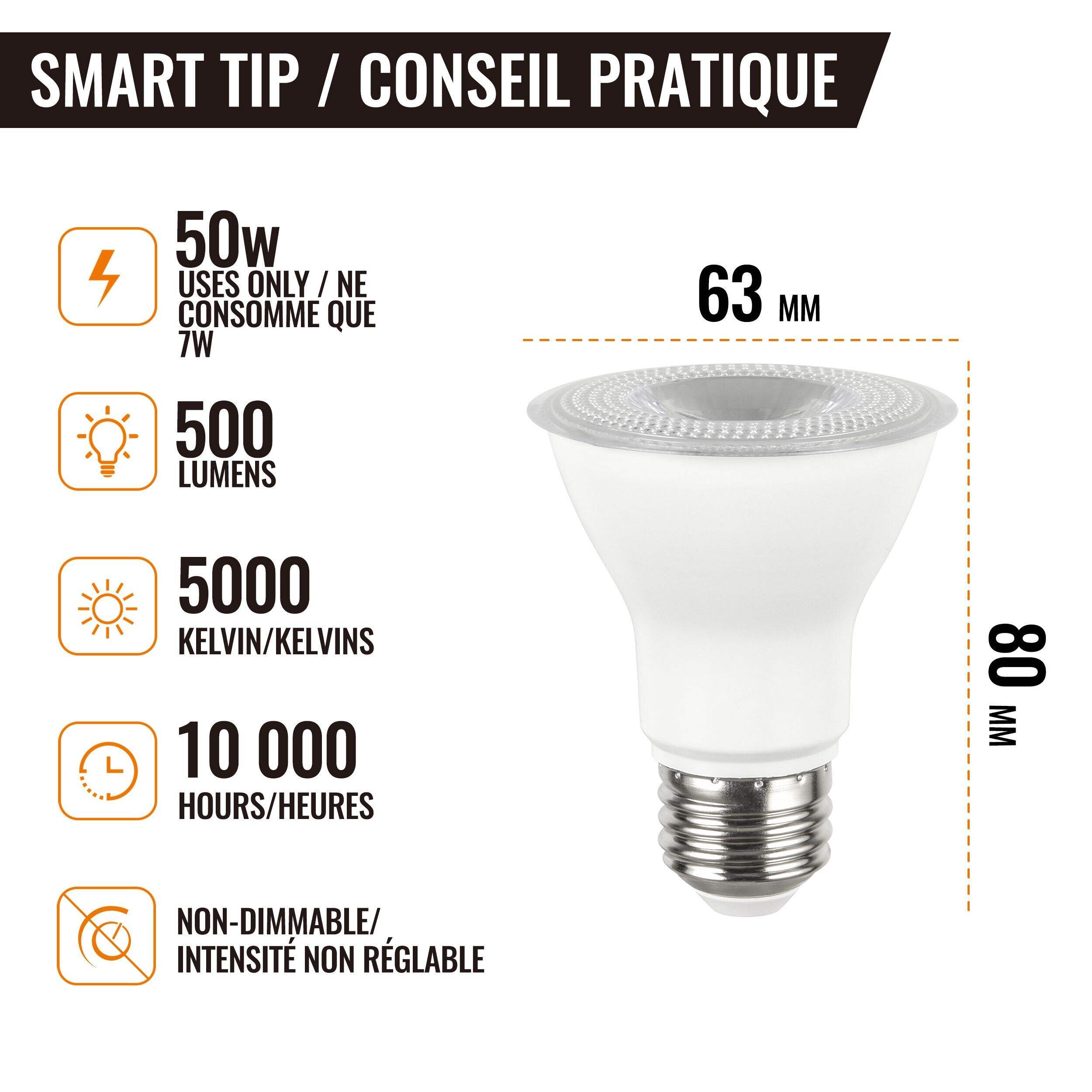 Gardez les lumières allumées avec ces ampoules pour projecteur à DEL à culot E26 d'intensité non variable NOMA PAR20. Ces ampoules créent une lumière vive et accueillante qui est idéale pour une utilisation domestique générale. Ces ampoules longue durée sont le complément idéal pour les pièces très fréquentées et fournissent un éclairage puissant tout en consommant moins d'énergie, ce qui vous permet de faire un choix écoénergétique pour toutes les pièces de votre maison.
