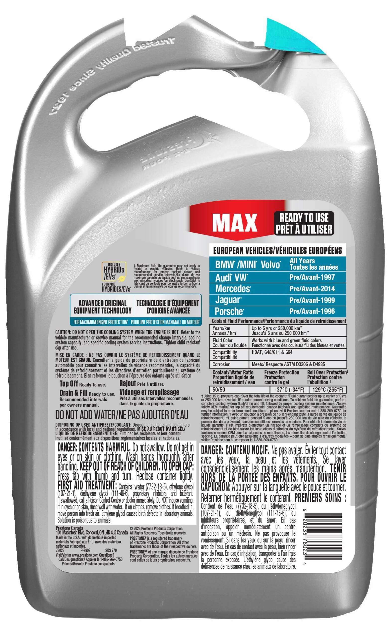 Le liquide de refroidissement et antigel PrestoneMD MAX utilise une technologie d'origine avancée pour protéger le moteur des véhicules fabriqués en Europe. La formule avancée de Prestone lui permet d'offrir une résistance élevée à la température, une protection inégalée dans l'industrie contre la rouille et la corrosion dommageables et une protection globale durable pour votre véhicule.
