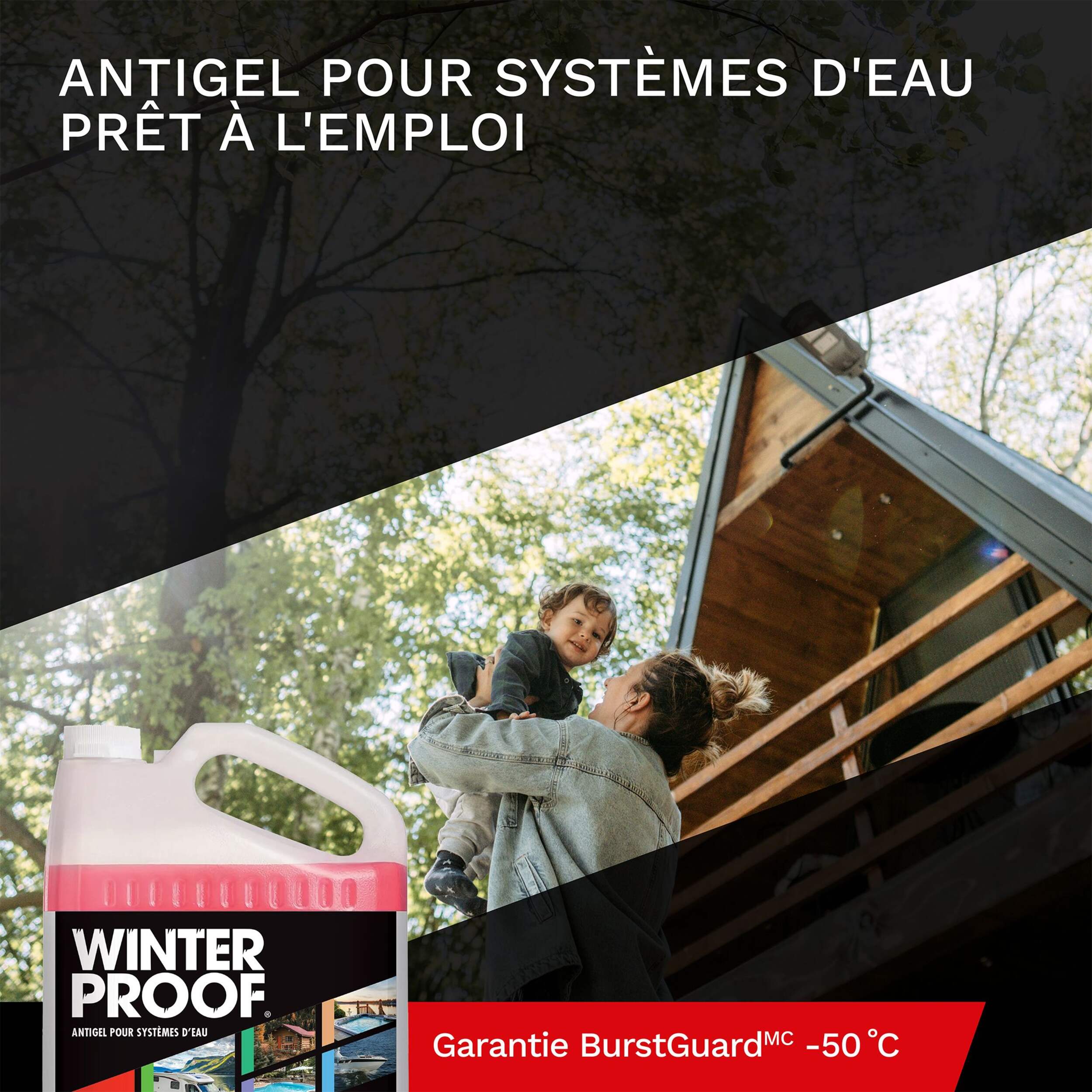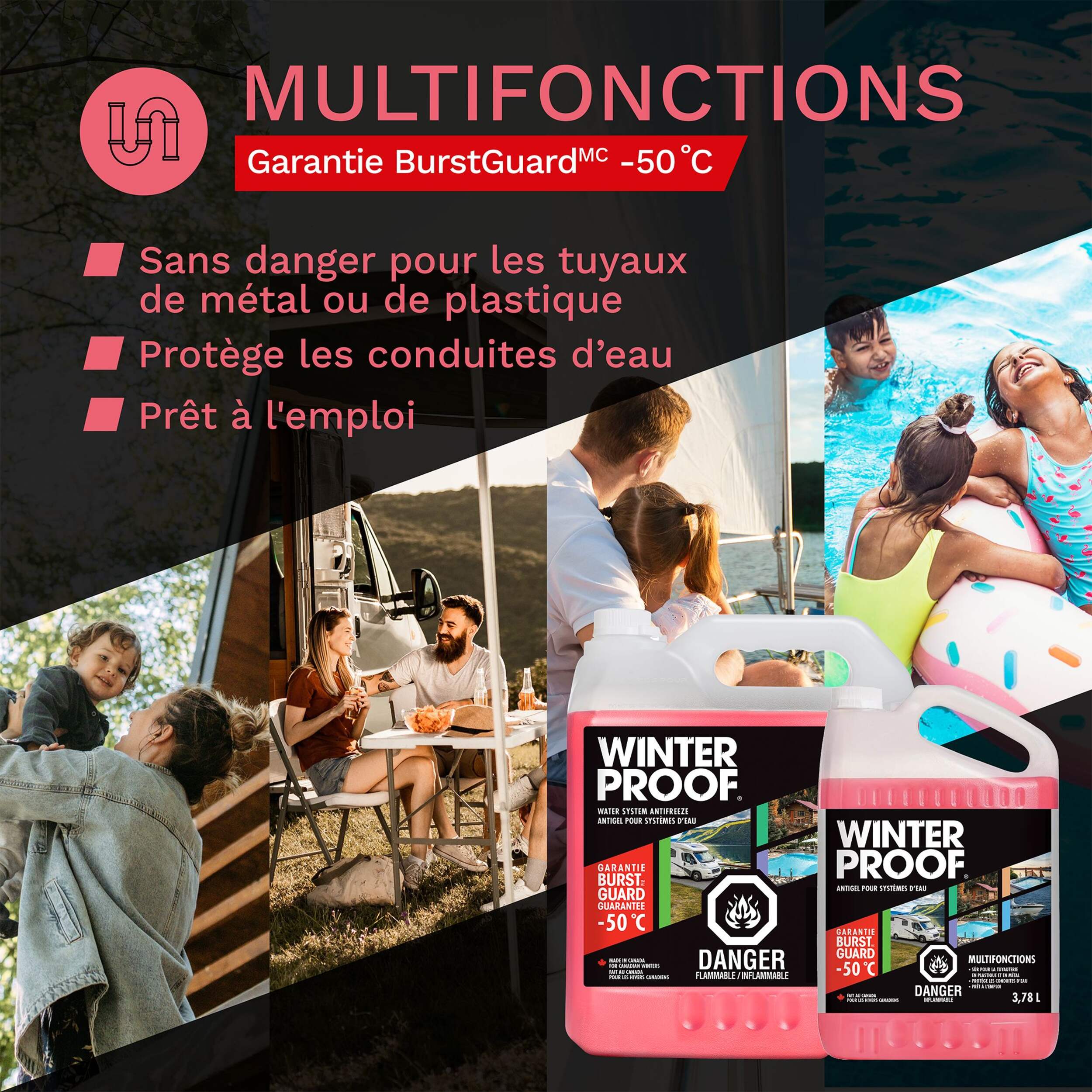 L'antigel tout usage pour système d'eau WinterProofMC avec garantie BurstGuardMC jusqu'à -50 °C vous offre la tranquillité d'esprit contre les hivers rigoureux canadiens. Évitez les réparations coûteuses et inattendues grâce à notre formule prête à l'emploi qui aide à protéger la précieuse plomberie de votre propriété contre les fissures, les éclats et autres dommages causés par le gel. Il est sans danger pour les tuyaux d'hiver en métal et en plastique, prévenant la rouille et la corrosion. Cette formule lubrifie aussi les conduites d'eau, les tuyaux et les joints pour garantir une expérience sans souci lorsque le temps commence à se réchauffer. Il est également formulé afin de préparer pour l'hiver tous les types de systèmes d'eau des roulottes, des VR, des piscines creusées ou hors terres, des spas, des chalets, des cabines, des bateaux (lignes d'eau seulement) et plus encore.