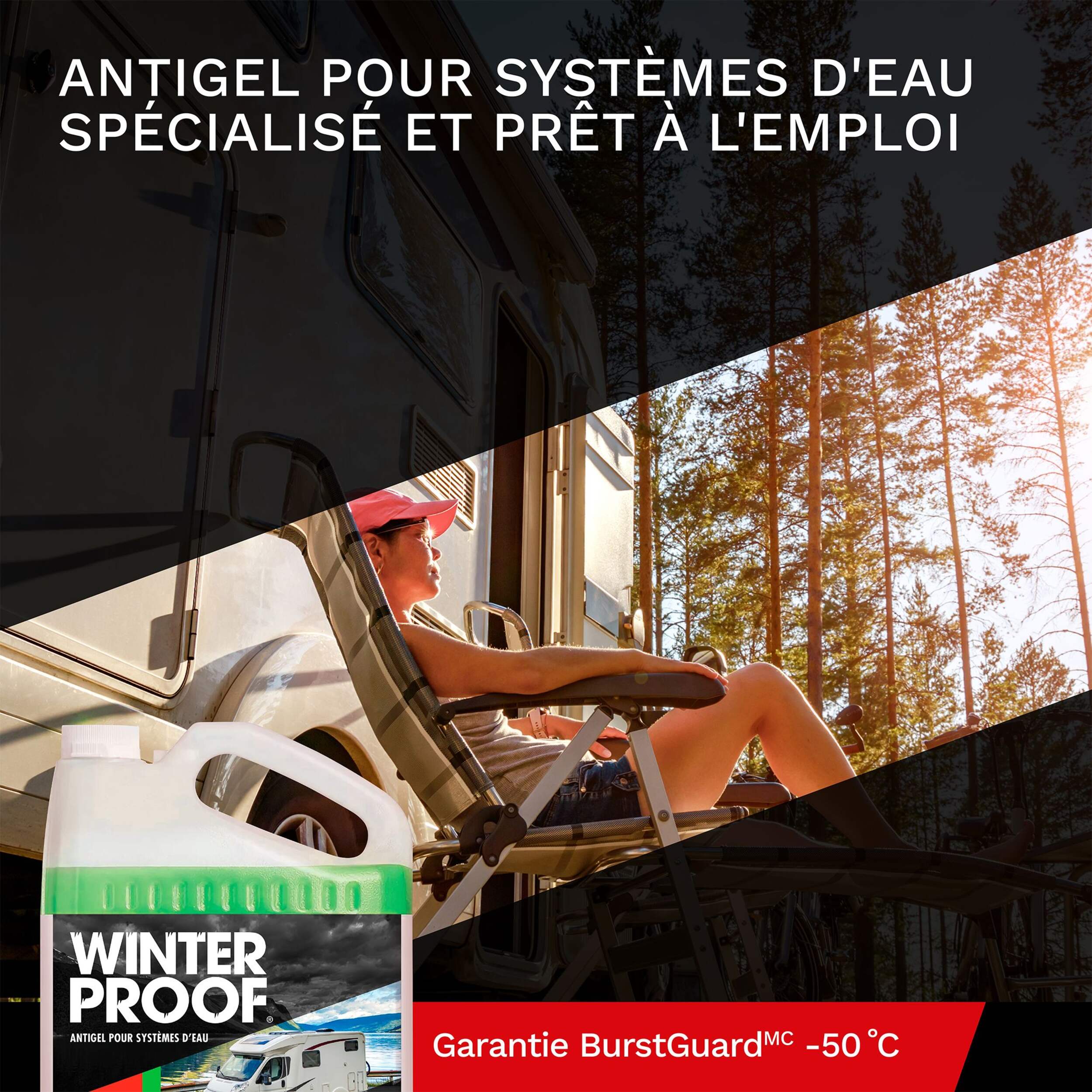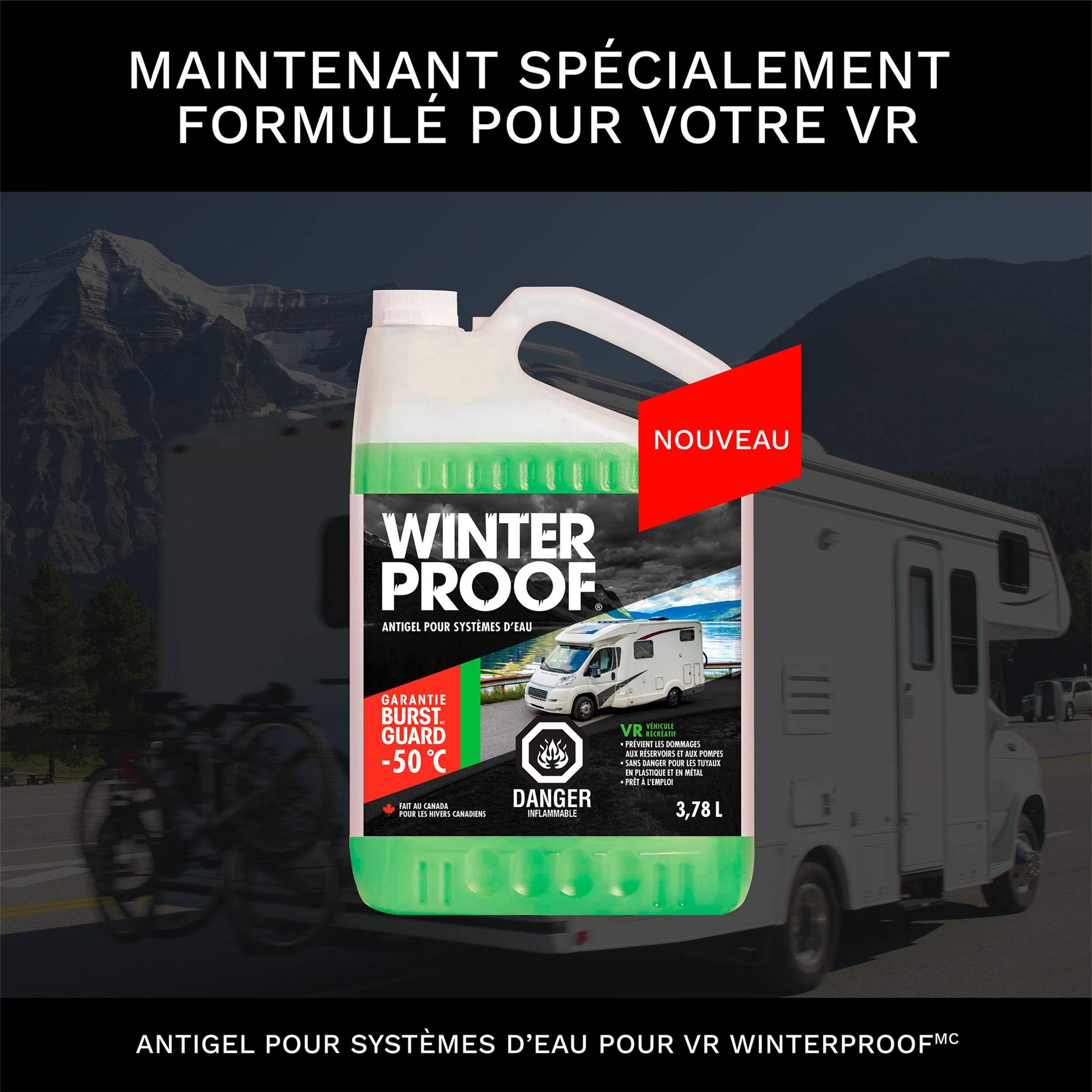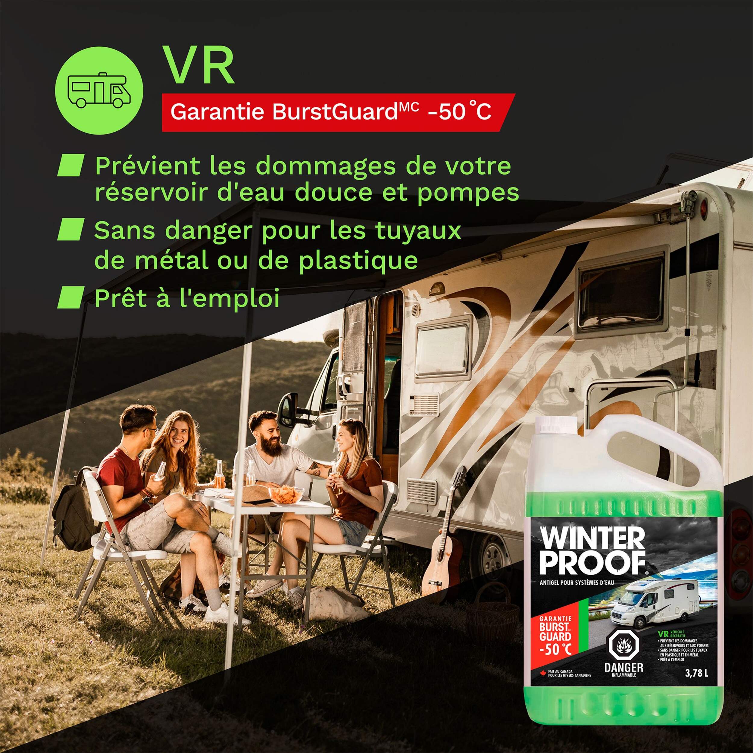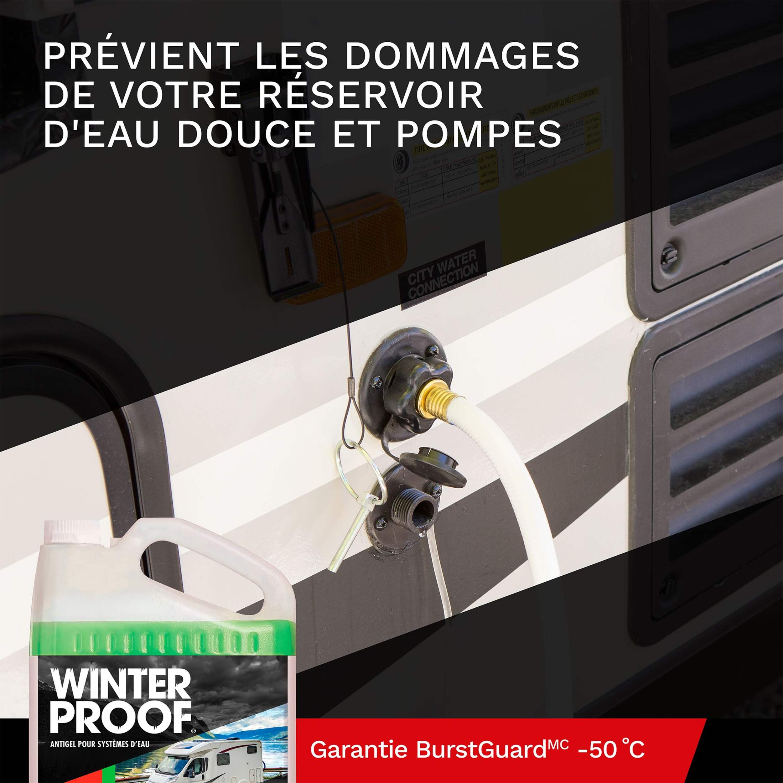 Antigel pour système d'eau VR WinterProof avec garantie BurstGuard jusqu'à -50°C, vous offrant la tranquillité d'esprit contre les rudes hivers canadiens. Notre formule prête à l'emploi aide à protéger le réservoir d'eau douce, les drains et les conduites d'eau de votre véhicule récréatif (VR) contre les fissures, les éclatements et autres dommages causés par le gel.