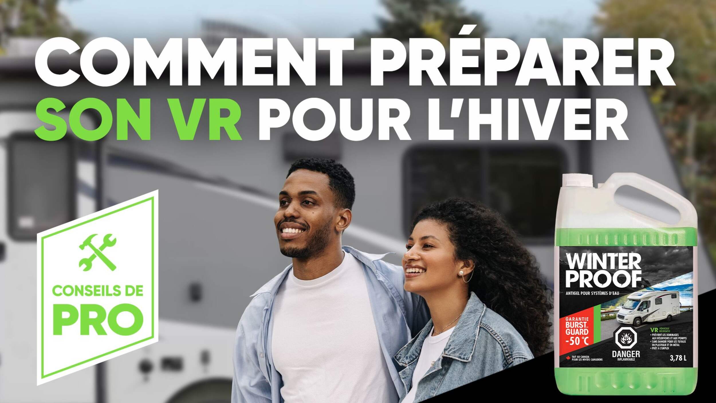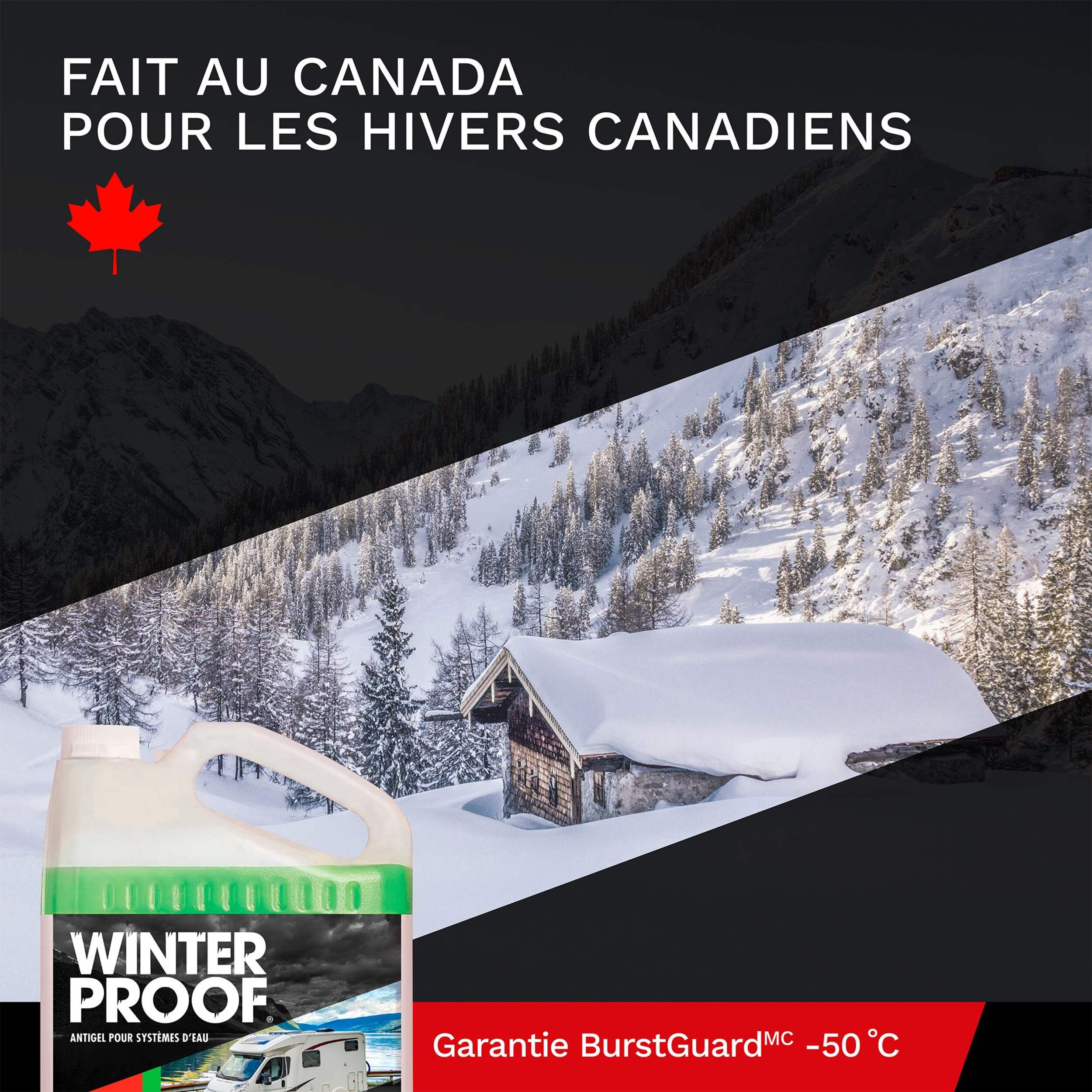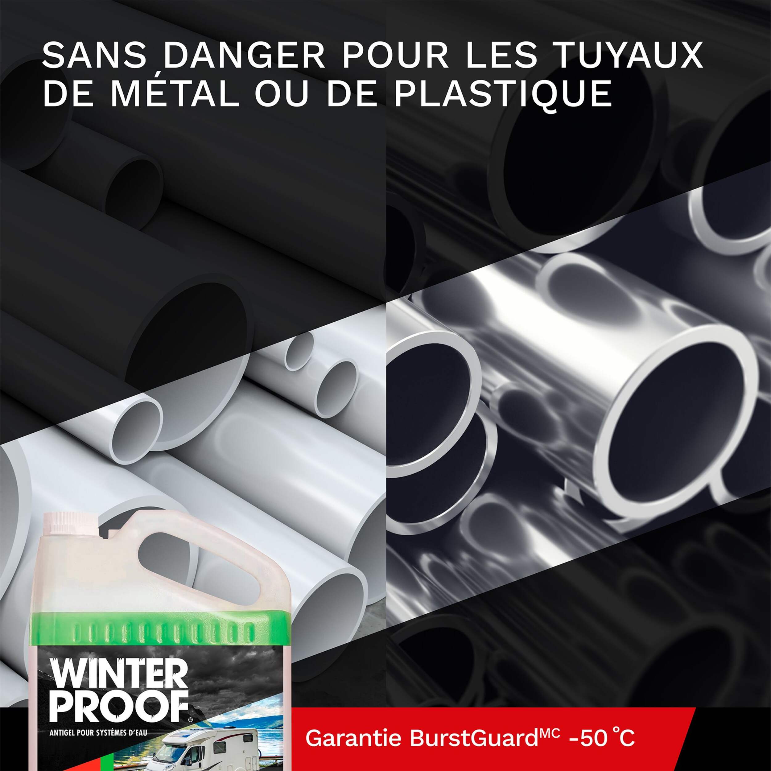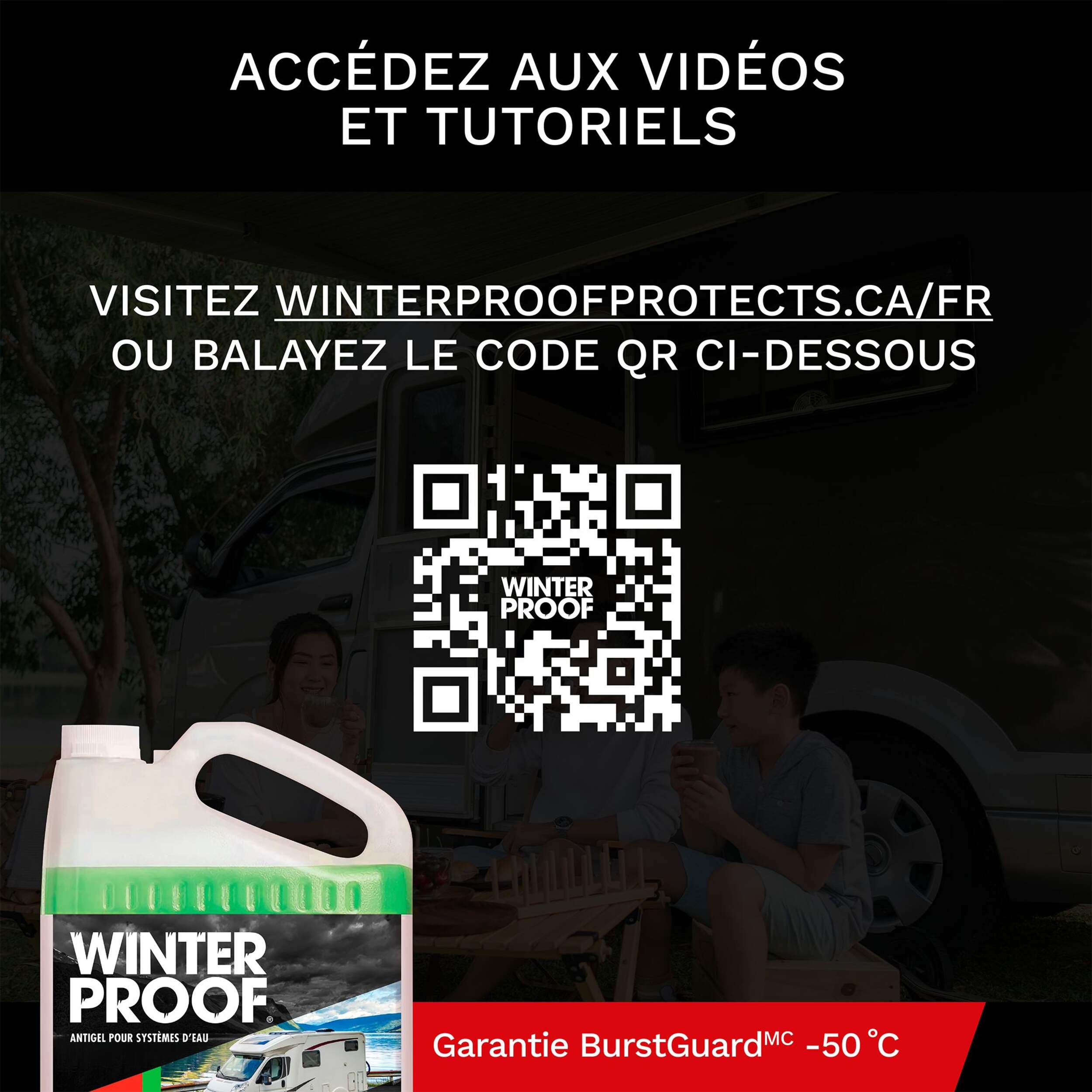 Antigel pour système d'eau VR WinterProof avec garantie BurstGuard jusqu'à -50°C, vous offrant la tranquillité d'esprit contre les rudes hivers canadiens. Notre formule prête à l'emploi aide à protéger le réservoir d'eau douce, les drains et les conduites d'eau de votre véhicule récréatif (VR) contre les fissures, les éclatements et autres dommages causés par le gel.