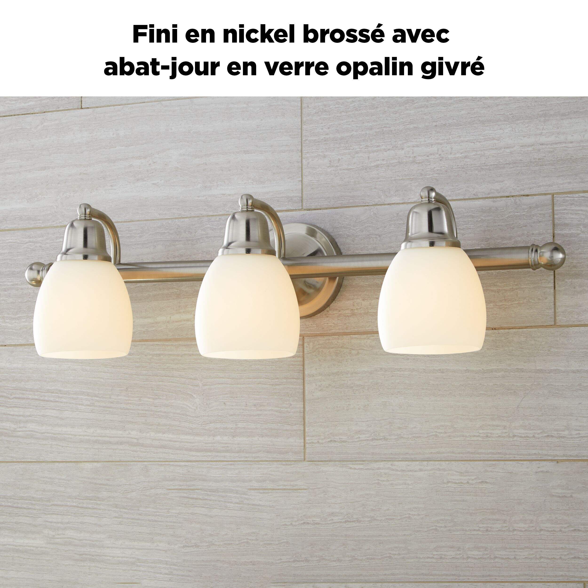 L'applique de salle de bain CANVAS Essence allie des éléments de style moderne et traditionnel pour rehausser le style de n'importe quelle salle de bains. Le fini nickel brossé attrayant offrant une esthétique subtile et raffinée qui s'harmonise à n'importe quel décor. Cette applique de salle de bain est dotée d'abat-jour opale givrés qui adoucissent la lumière des ampoules pour rendre l'espace plus chaleureux et confortable. Idéal pour les salles de bains équipées de 2 éviers côte à côte, ce luminaire est aussi une option au-dessus de l'évier de cuisine.