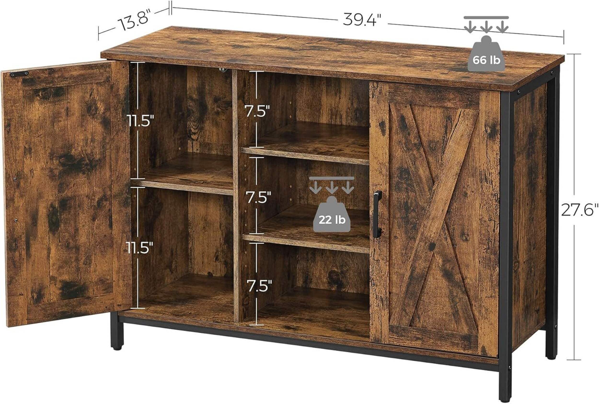 Grand espace de rangement avec un dessus de table spacieux, 3 compartiments ouverts et 2 tablettes réglables dissimulées derrière les élégantes portes de grange