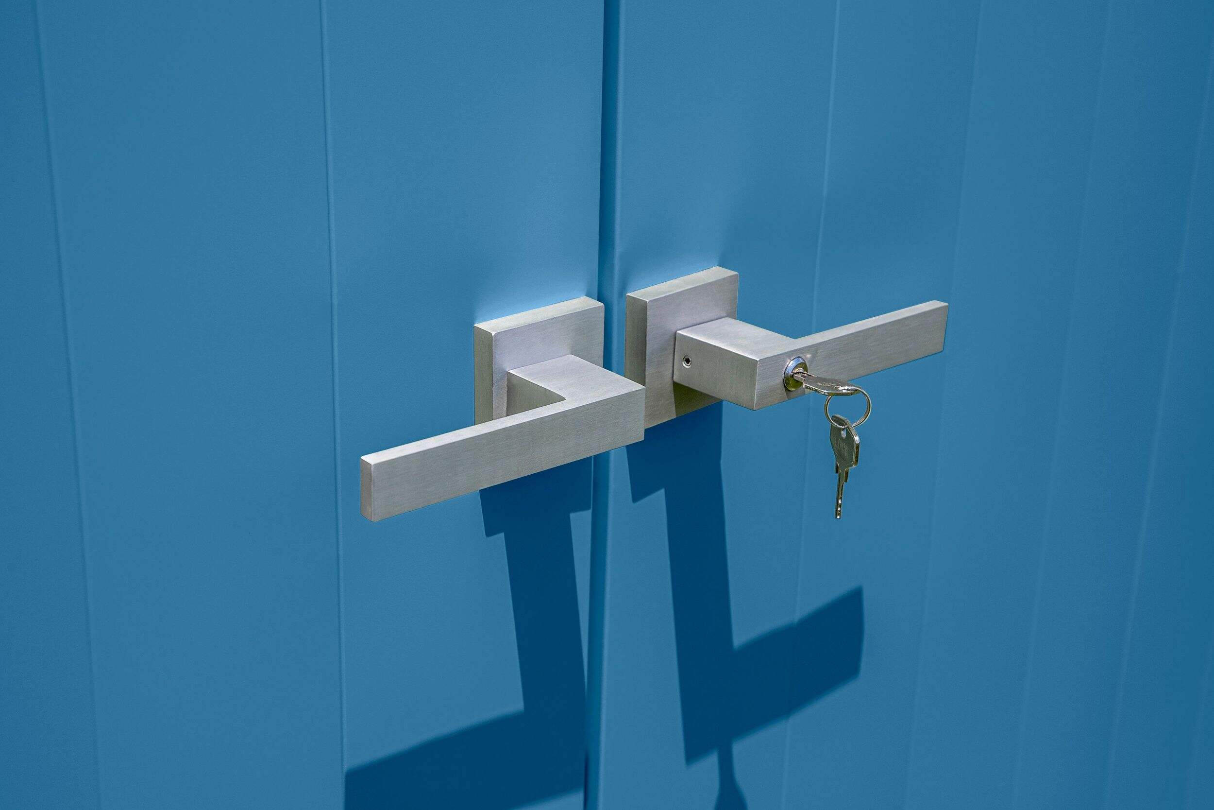 Portes battantes pour un dégagement dans l'entrée et un espace de rangement accrus; poignées de verrouillage intégrées en métal brossé à clé pour plus de sécurité et une allure sophistiquée
