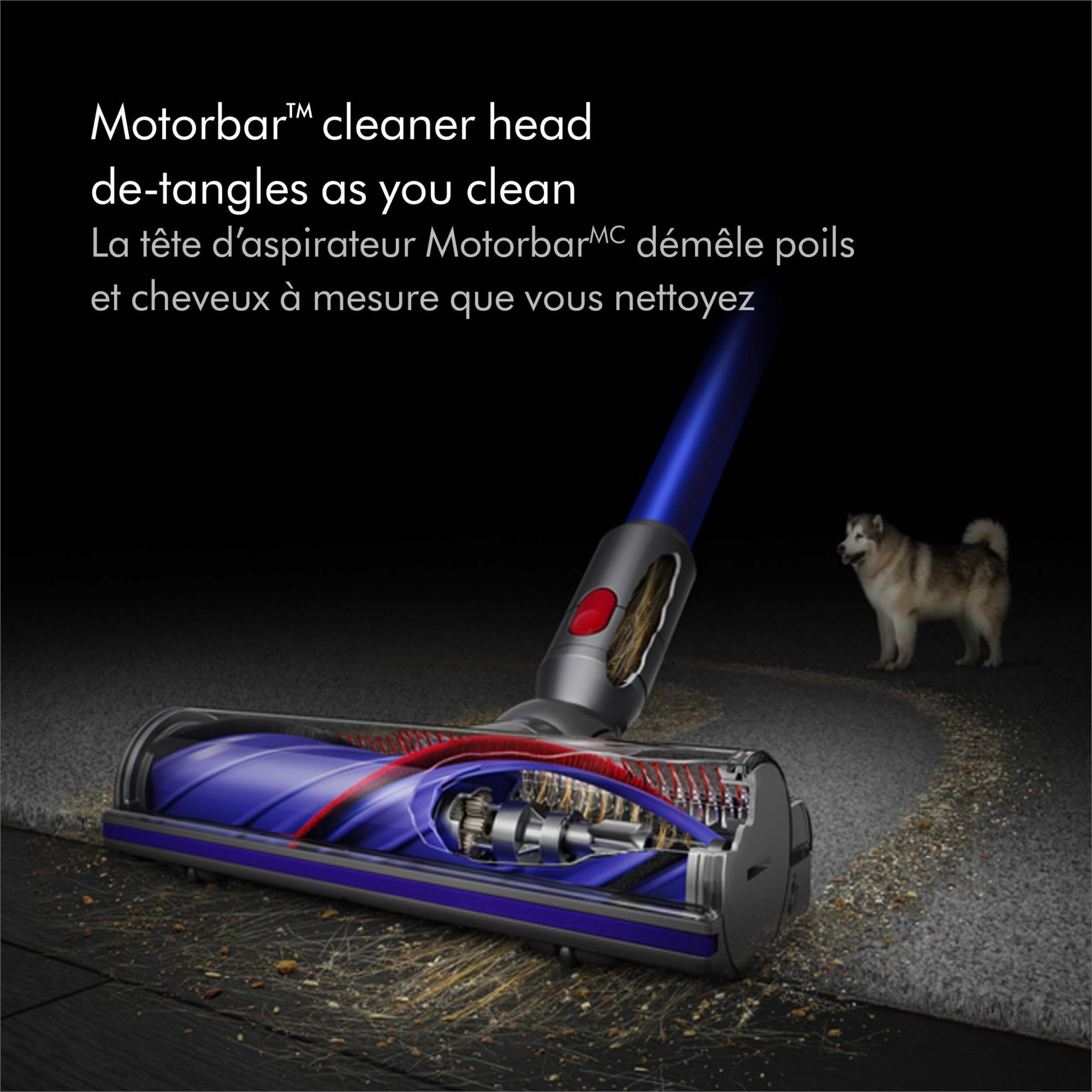L'aspirateur Dyson V11 est un appareil à la fois polyvalent et puissant pour le nettoyage en profondeur de toute la maison sans fil. La tête de nettoyage MotorbarMC nettoie en profondeur les tapis et les sols durs, et l'écran ACL affiche le mode de puissance, l'autonomie et les alertes d'entretien.