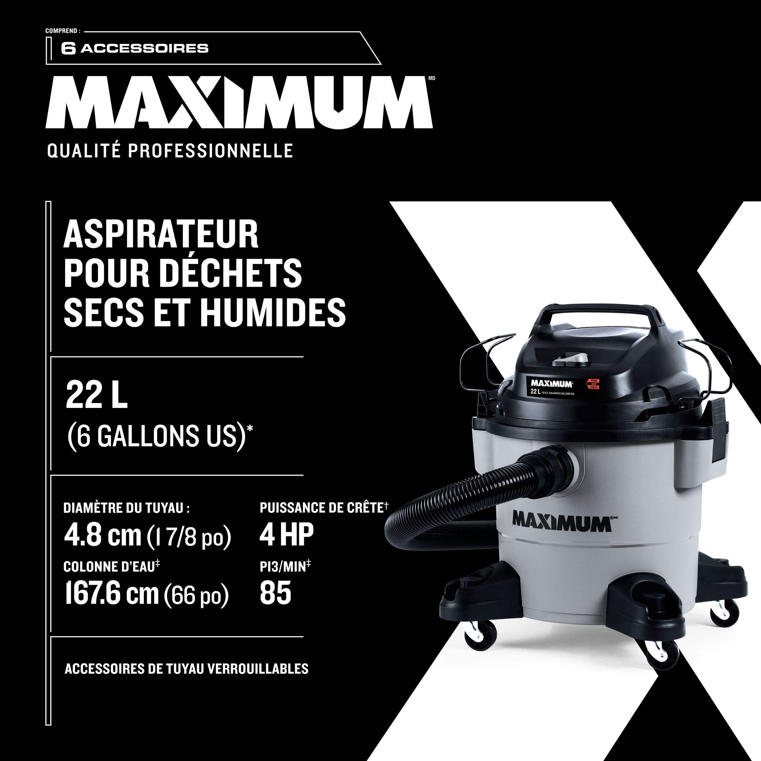 Accessoires inclus : tuyau EVA de 7 pi x 1-7/8 po, suceur polyvalent verrouillable, (2) rallonges verrouillables, filtre à cartouche pour poussière fine et filtre en mousse pour déchets humides