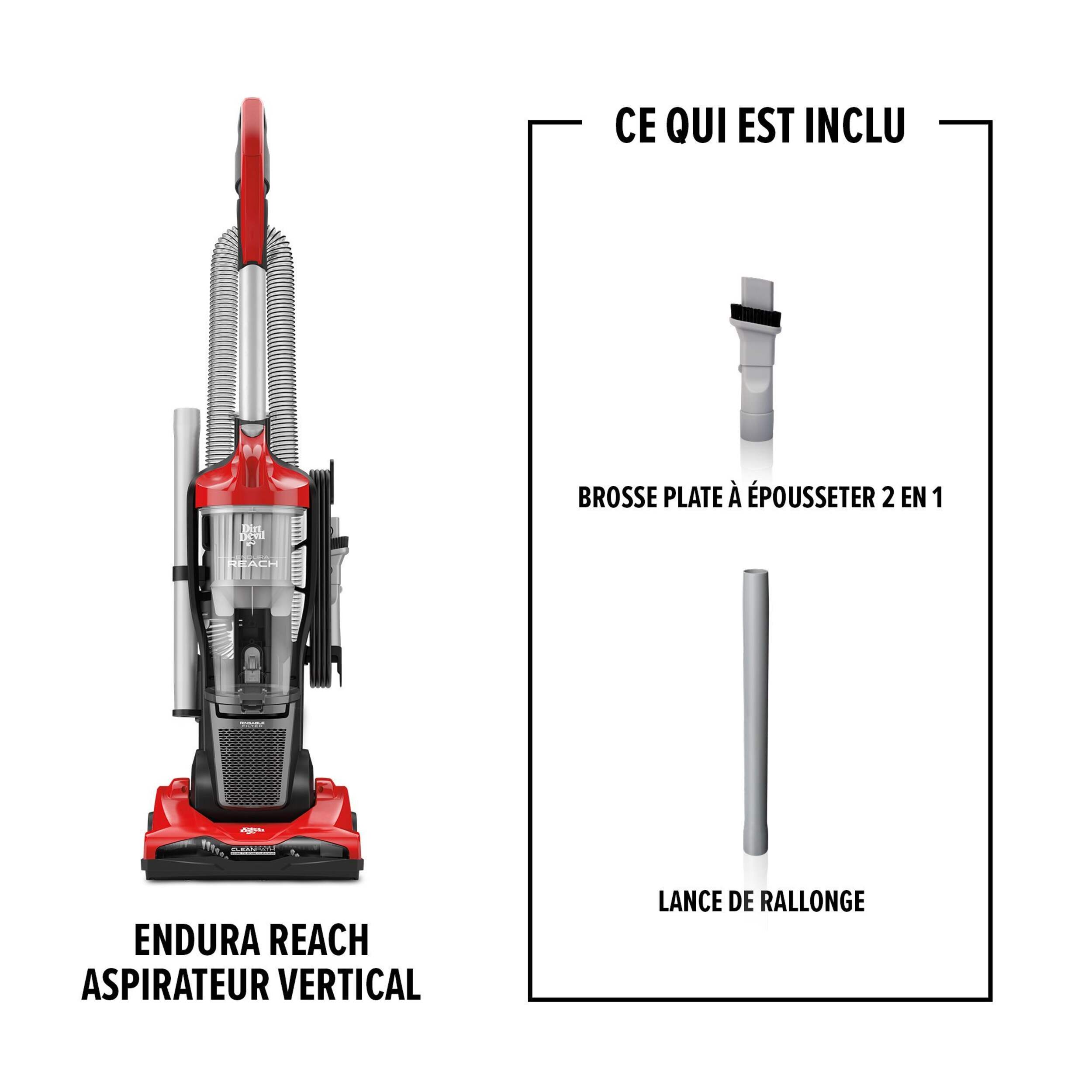 L'aspirateur EnduraMC Reach est doté d'une aspiration puissante qui s'attaque à la saleté partout dans la maison grâce à son système de filtration EnduraMC amélioré. Ce modèle compact avec une rallonge à dégagement rapide offre une portée de nettoyage supplémentaire de 10 pi pour nettoyer facilement tous les dégâts, tandis que le rouleau de brosse multisurfaces déloge la saleté sur les tapis et les planchers durs.