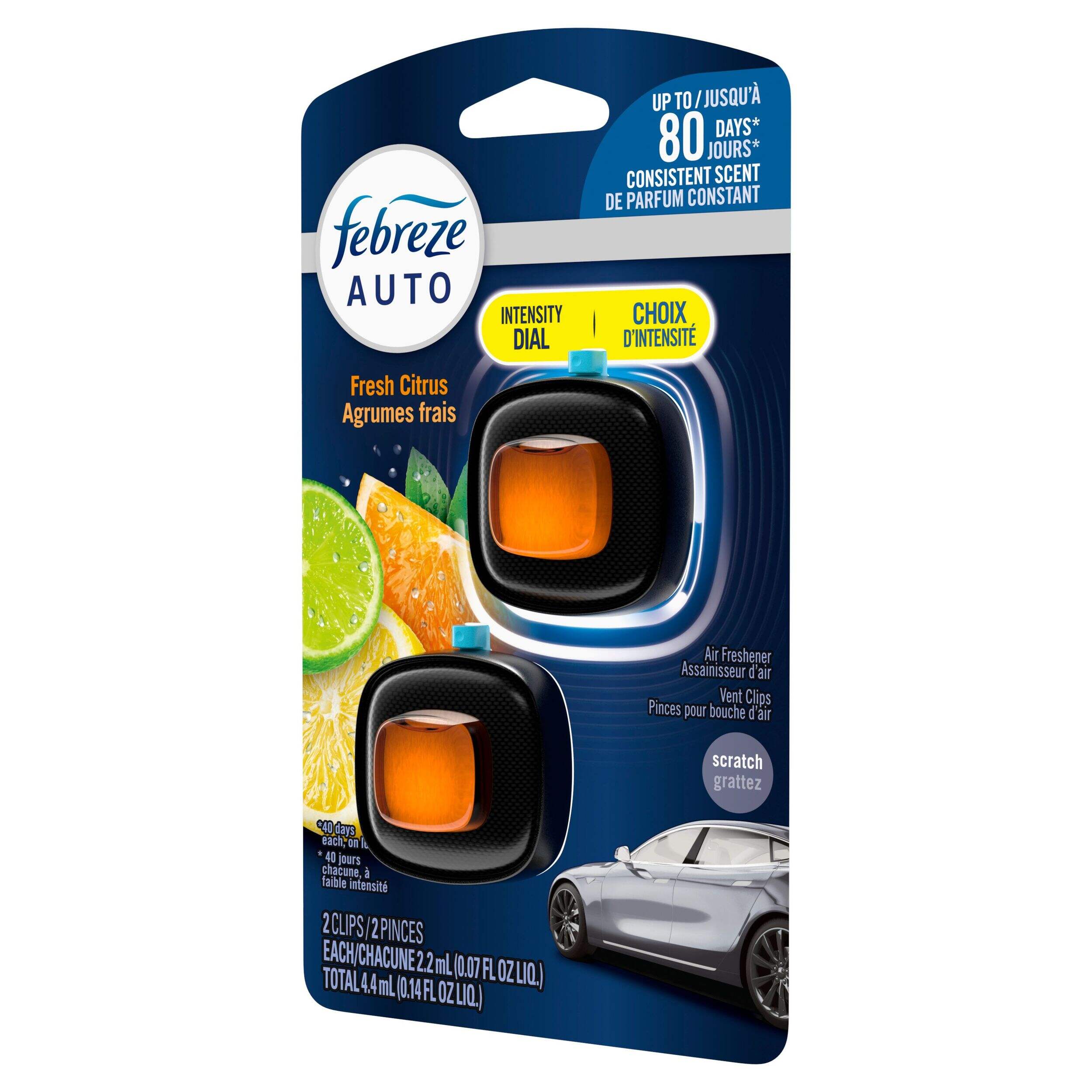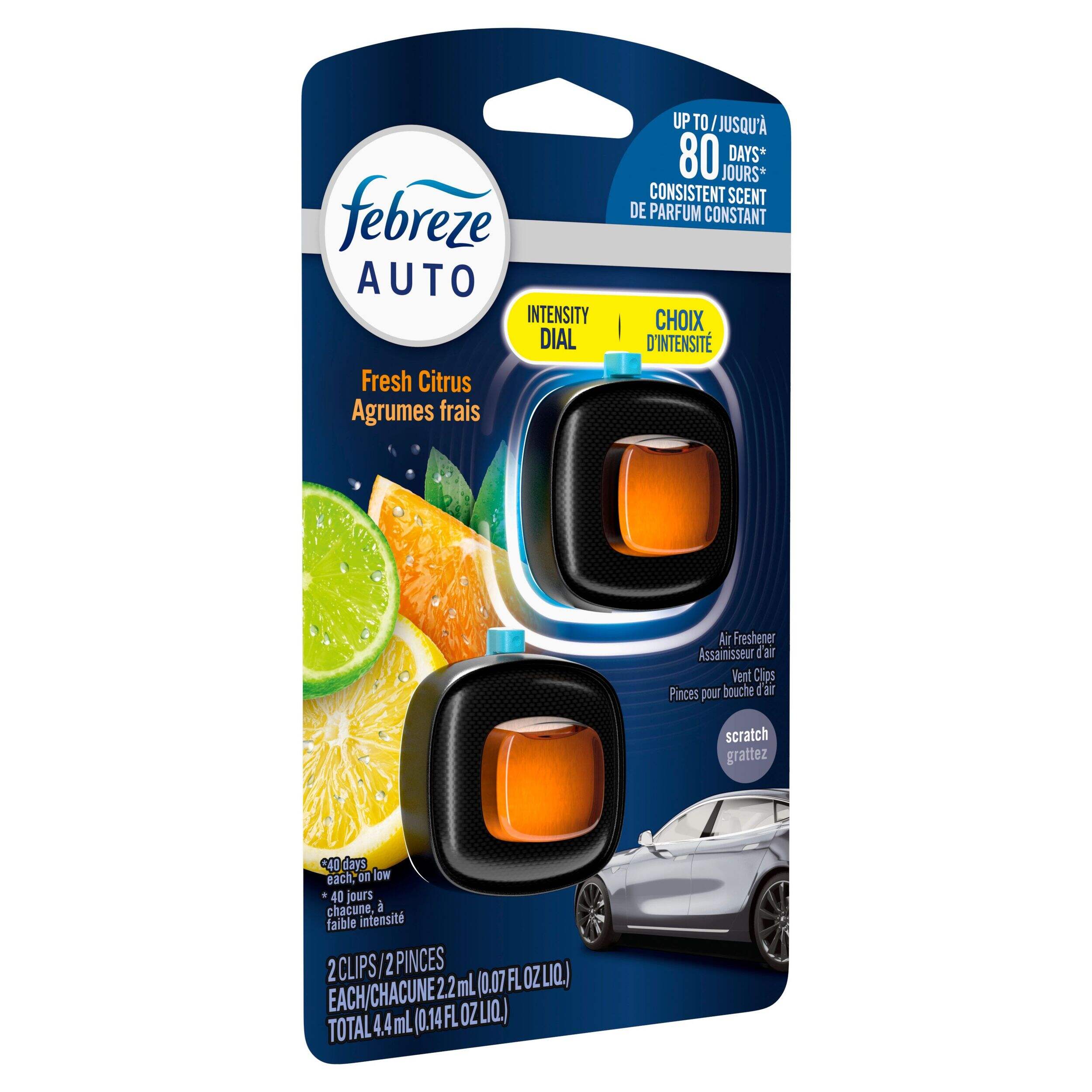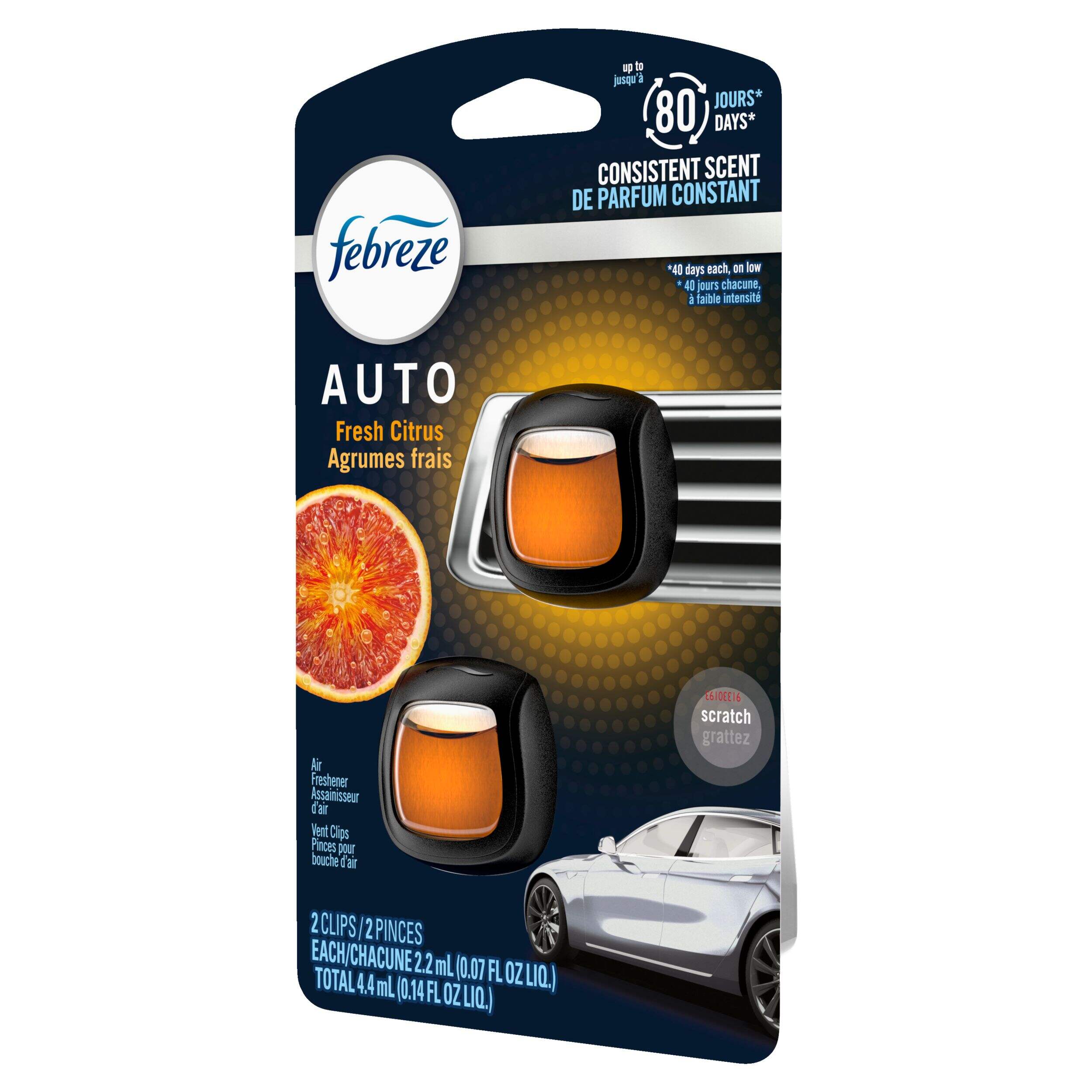 Assainisseur d'air pour bouche d'aération Febreze Auto au parfum d'agrumes frais qui est l'incarnation de la fraicheur avec un parfum diffusé de façon constante jusqu'à 40 jours