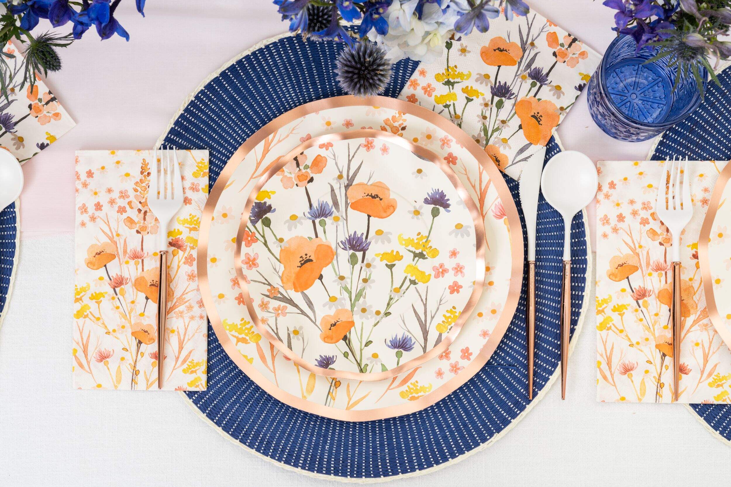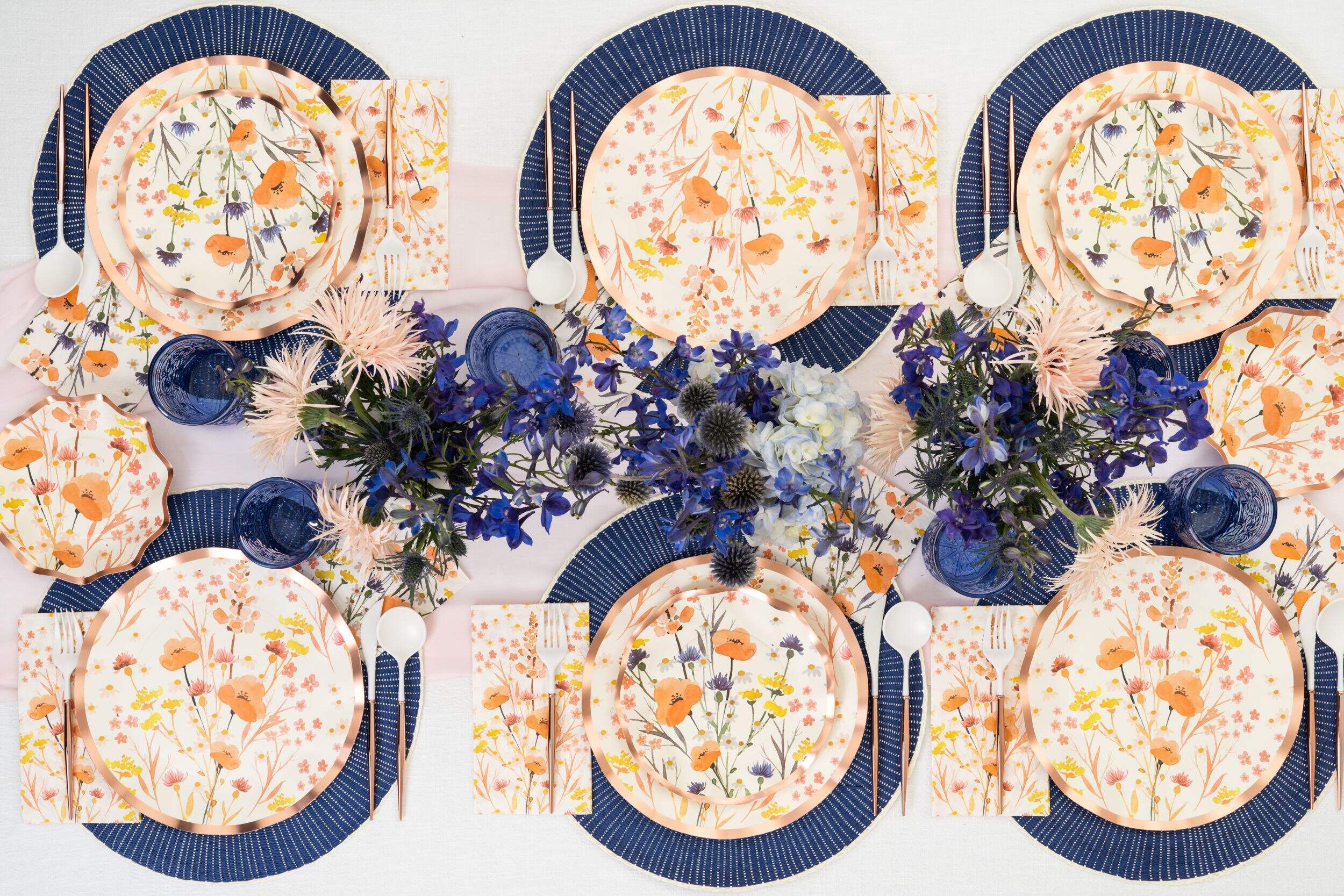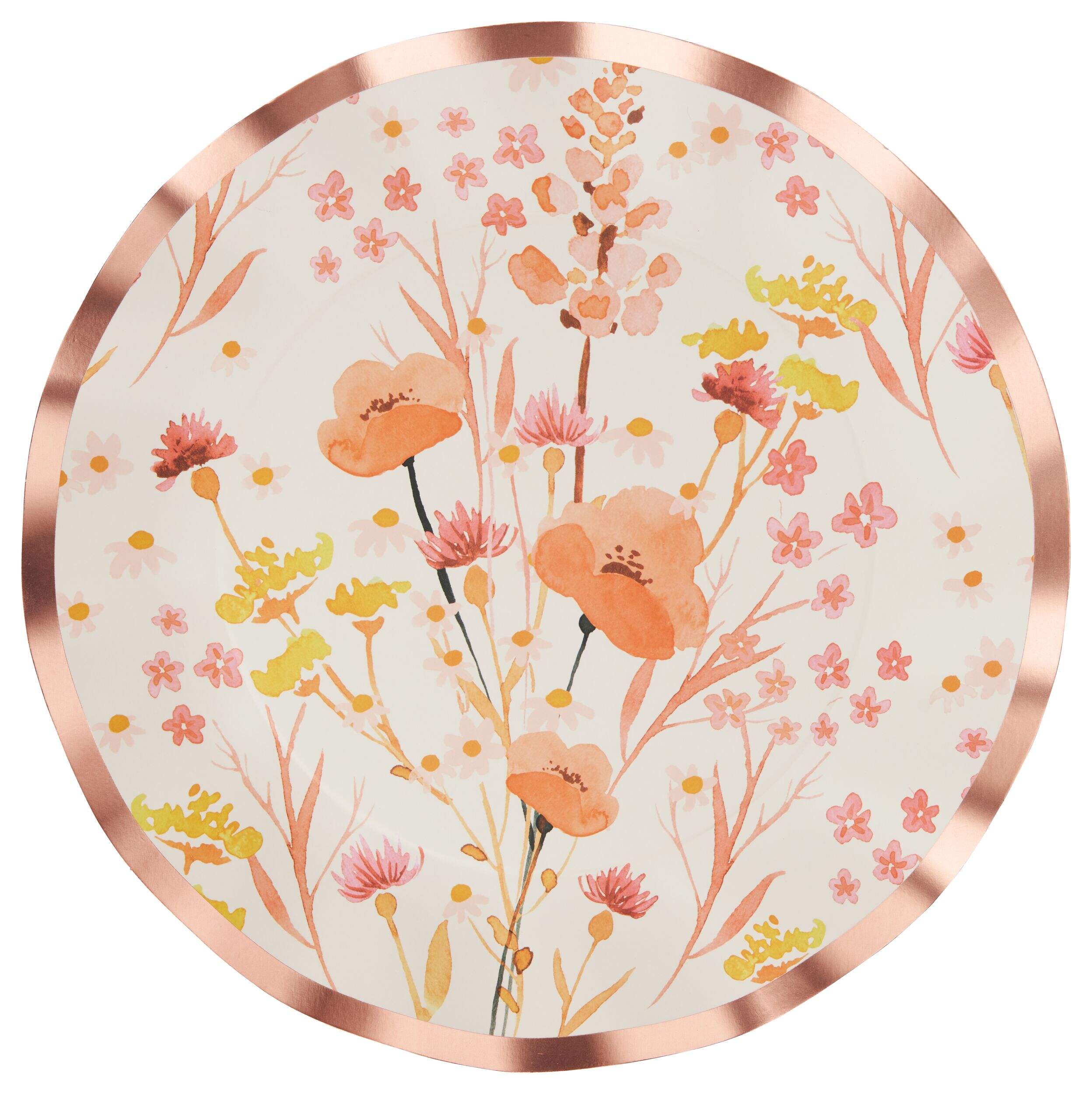 Ces assiettes à volants avec bordure en aluminium rose doré ajoutent une touche d'élégance à n'importe quelle réception printanière. Le superbe motif de fleurs sauvages de couleur pêche impressionnera vos invités sans coûter une fortune. À seulement 19,99 $ pour un paquet de 8, ces assiettes en papier offrent tout le style de la porcelaine fine pour une fraction du prix.
