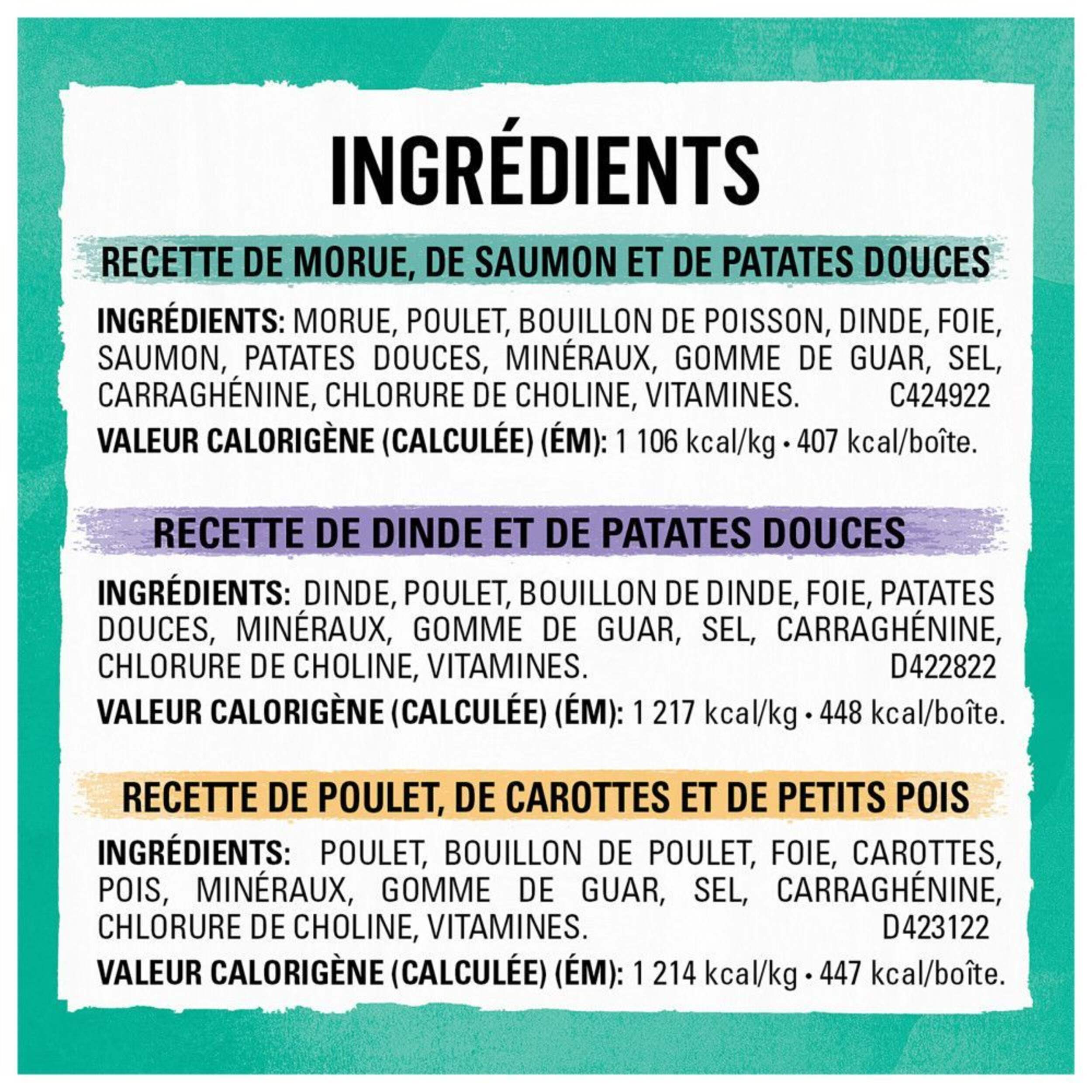 Comprend : (2) boîtes de morue, de saumon et de patate douce, (2) recette de poulet, de carottes et de pois et (2) recette de dinde et de patates douces