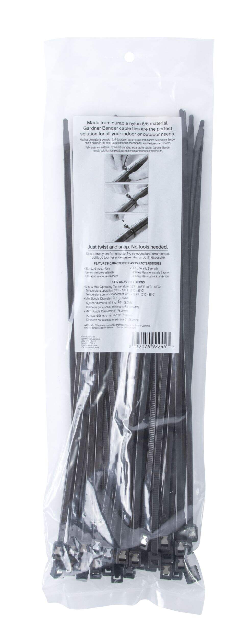Gagnez du temps et épargnez-vous de la frustration en utilisant la dernière innovation de Gardner Bender; l'attache à câble auto-coupante. Facile à utiliser; il suffit de verrouiller et de tourner pour terminer le travail, sans avoir besoin d'un outil de coupe supplémentaire! Contrairement aux autres attaches « torsions », notre conception brevetée ne nécessite pas de réduction de la force et de la durabilité du matériau de fixation du câble ou de multiples rotations pour faire une rupture dans le lien. Au lieu de cela, une petite lame de coupe conçue dans la tête de chaque attache assure un blocage serré et une coupe rapide et nette, améliorant l'apparence du résultat final et éliminant pratiquement les bords irréguliers qui peuvent trancher la peau nue. Les attaches sont faites de nylon 6/6 durable et offrent une résistance à une traction de 50 lb.