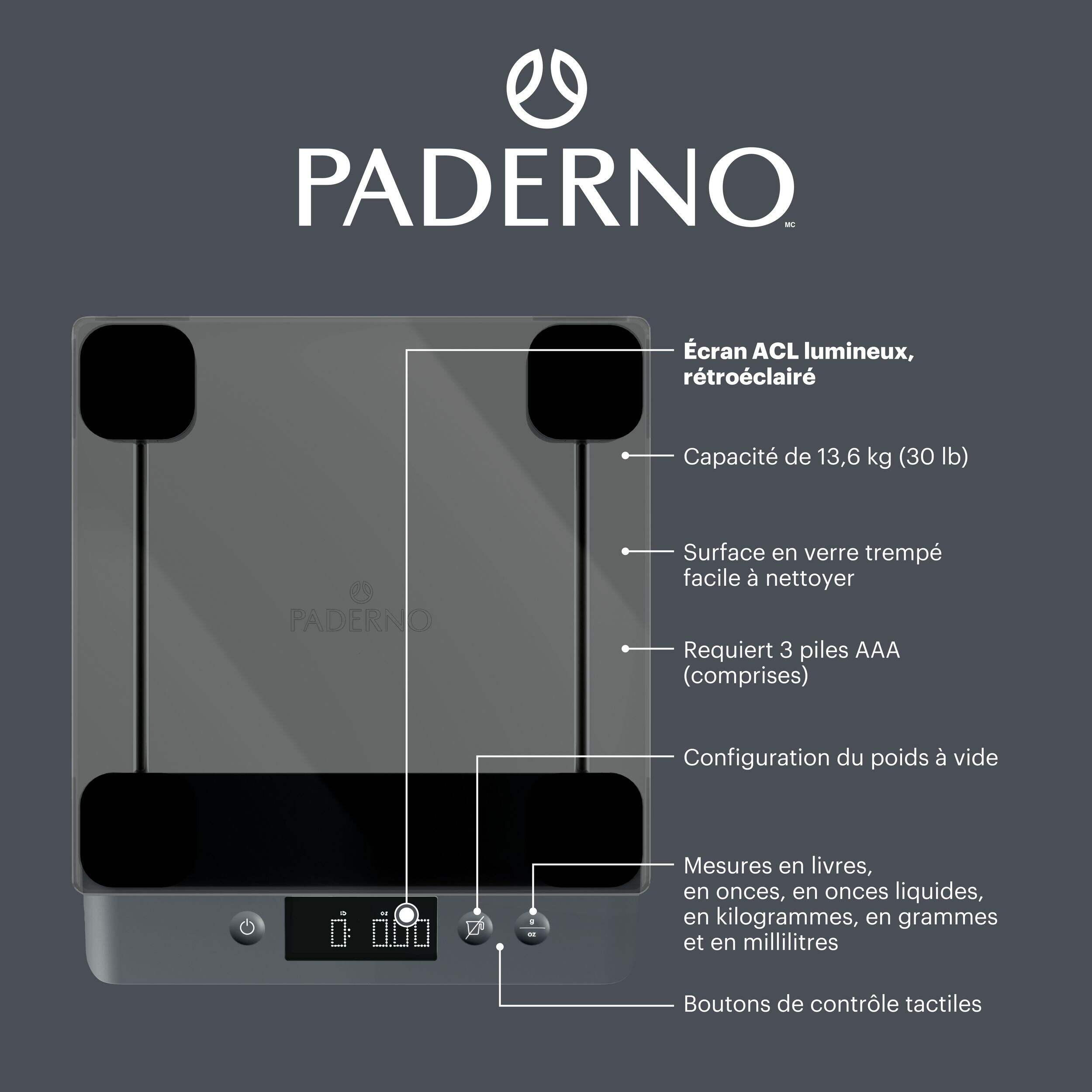 Que ce soit pour peser des ingrédients secs ou humides, cette balance de cuisine PADERNO numérique est votre outil de mesure idéal pour toutes vos aventures culinaires. Avec une capacité maximale robuste de 13,6 kg (30 lb), cette balance de cuisine portative est dotée d'une plateau en verre antimicrobien de grande qualité pour des mesures hygiéniques. L'écran numérique rétroéclairé lumineux de la balance de cuisine affiche les livres, les onces, les onces liquides, les kilogrammes, les grammes et les millilitres, avec une fonction de tare pour retirer le poids des contenants afin d'obtenir des lectures précises.