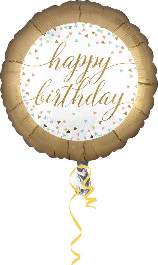 Ballon Happy Birthday Confettis, doré est doté d'une bordure dorée classique et d'un message « Happy Birthday » sur un fond blanc