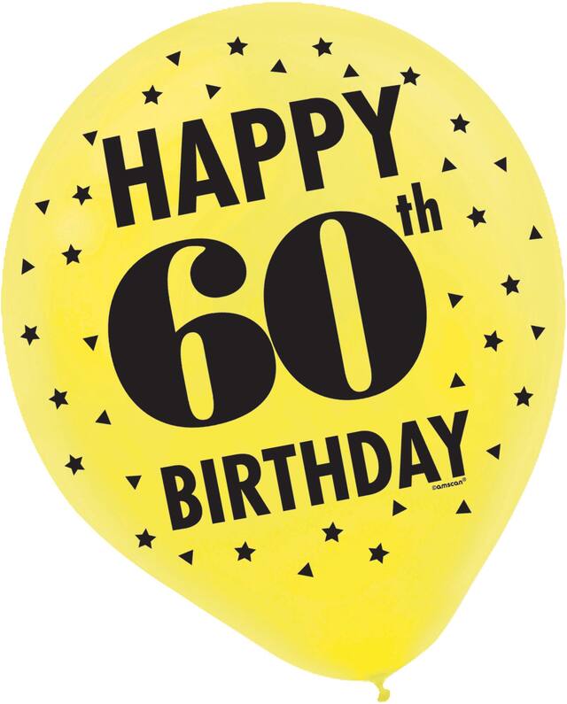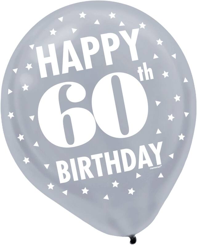 Ballons en latex offerts en gris, vert, violet, rouge et jaune, et affichant le message « Happy 60th Birthday »