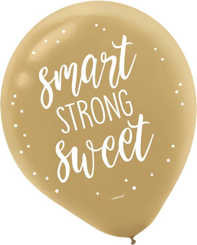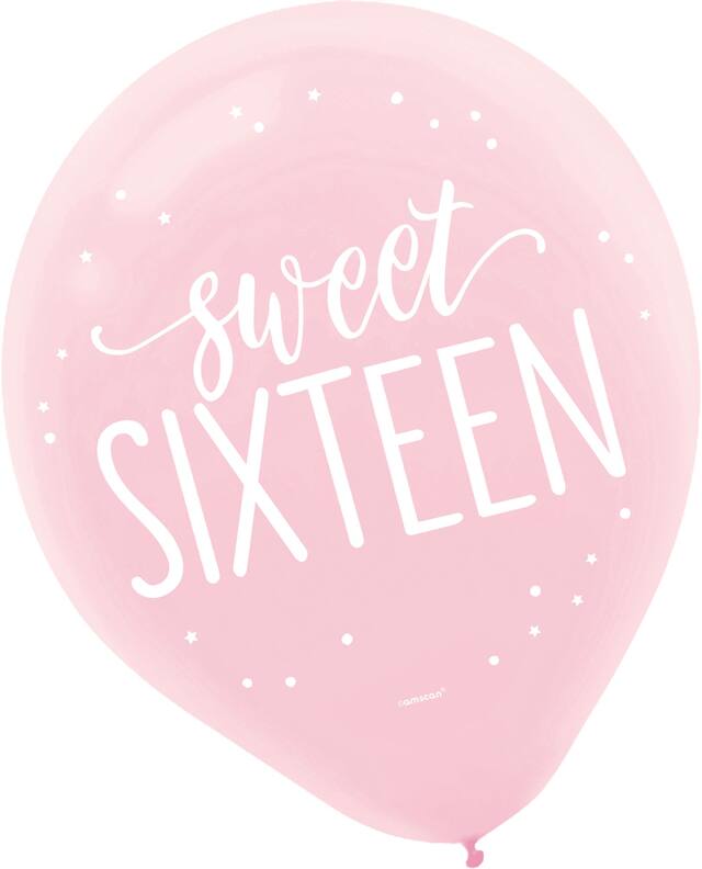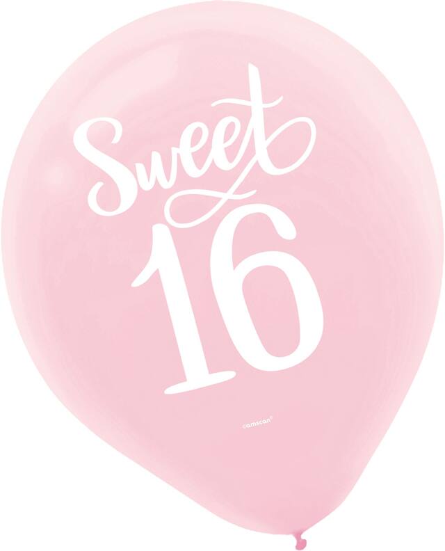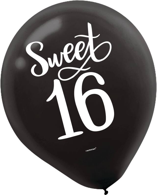 Ballons Sweet 16 offerts avec des ballons en latex noirs, dorés et roses portant les mots « Sweet Sixteen » et « Smart Strong Sweet »