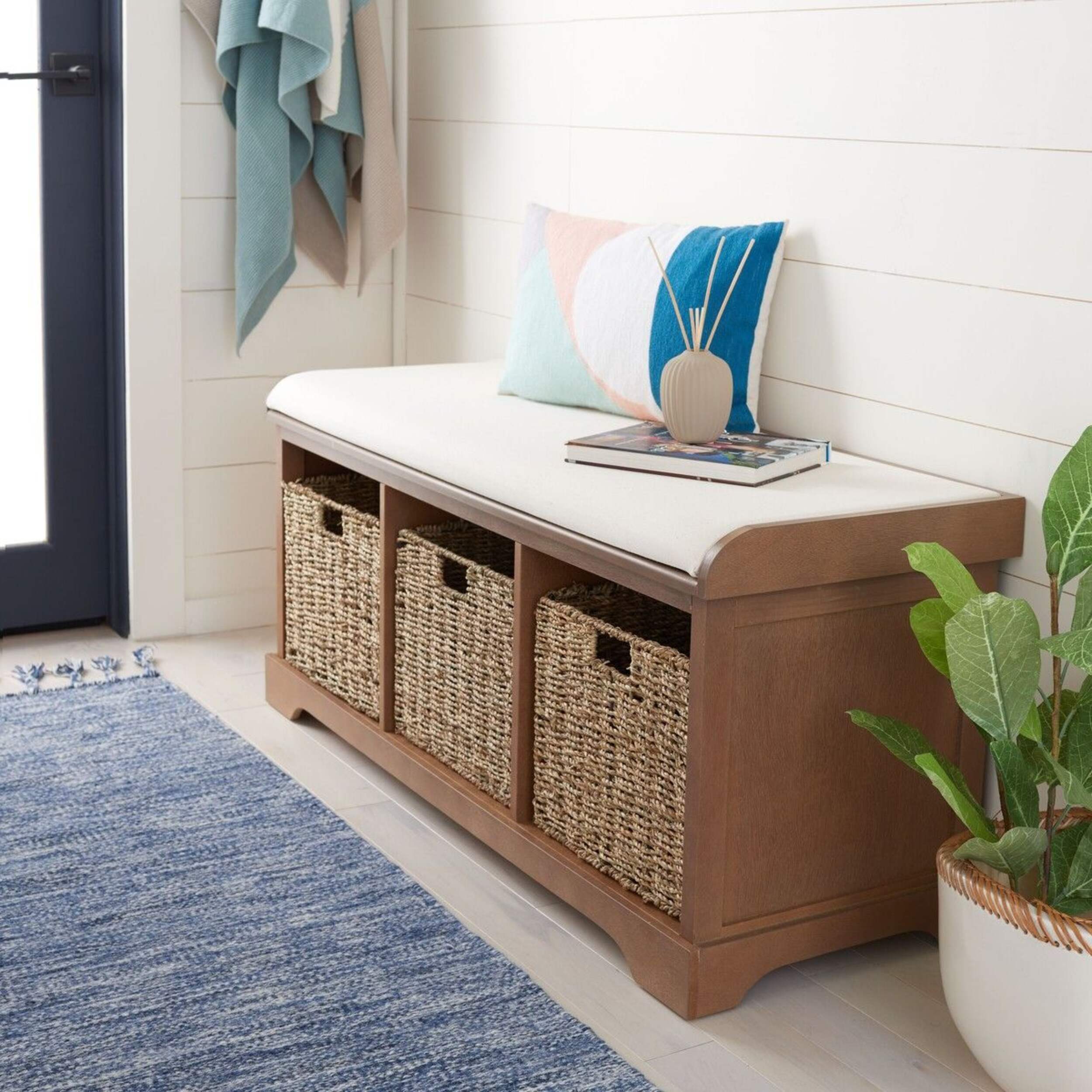 Banc de rangement en osier Safavieh Lonan qui est le perchoir idéal pour enlever les bottes ou les chaussures de jardin dans une entrée ou un vestiaire