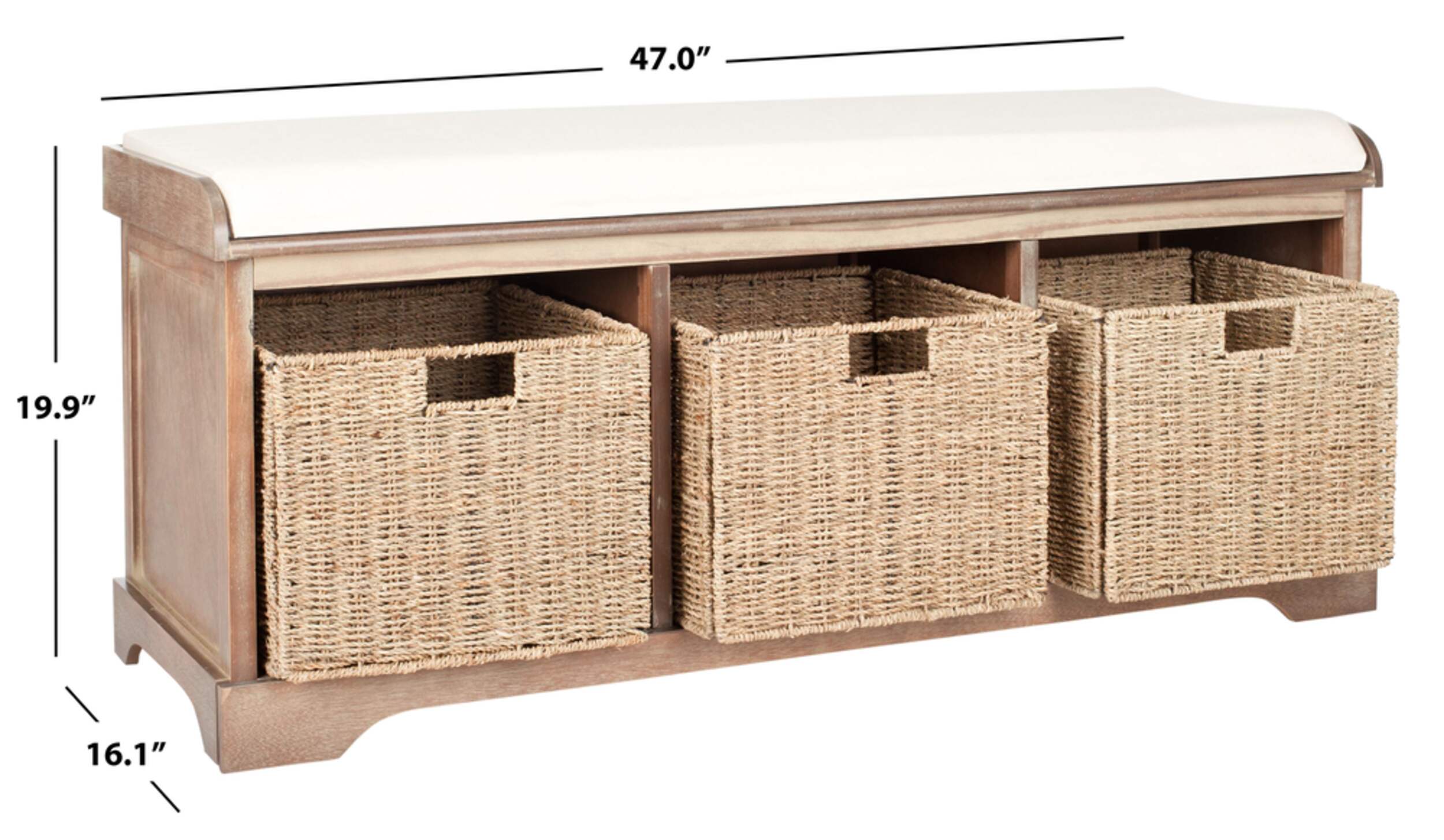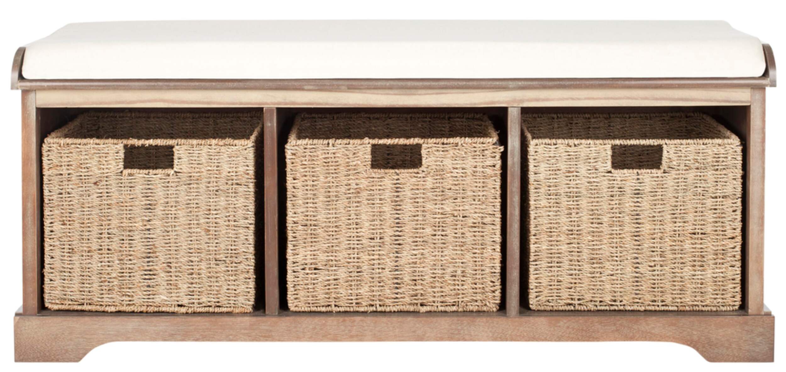 Banc de rangement Lonan qui est l'endroit parfait pour enlever ses bottes dans une entrée ou ses chaussures de jardinage dans un vestibule. Fabriqué en pin au fini gris délavé, le banc Lonan est doté de 3 paniers tissés amovibles offrant un rangement pratique et d'un coussin en coton blanc confortable qui lui confère un charme rustique.