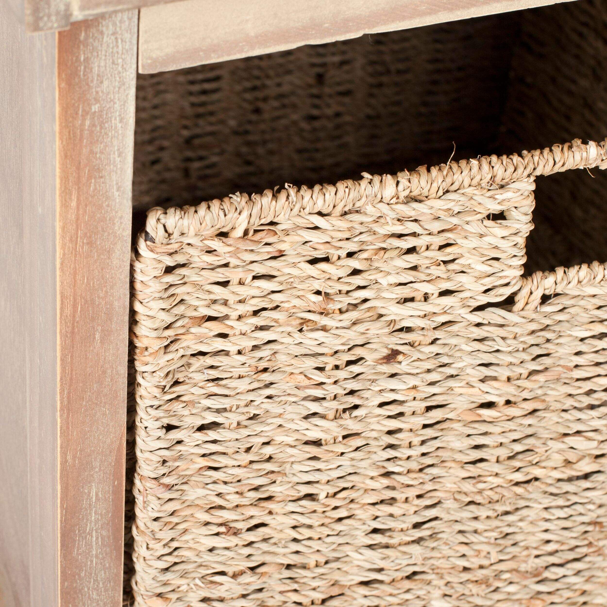 Fait de pin au fini naturel clair, ce meuble pratique est doté de trois bacs de rangement amovibles en osier tressé