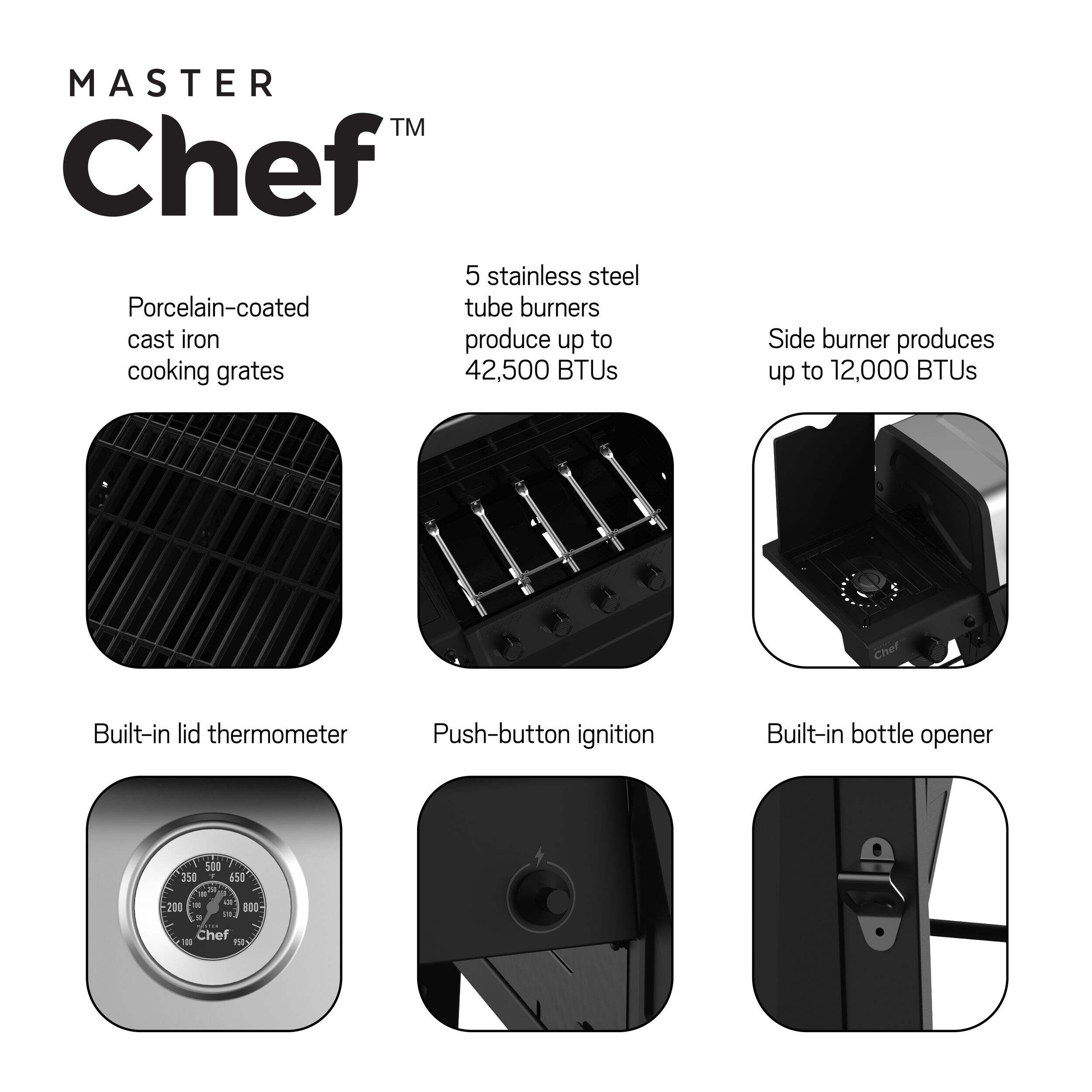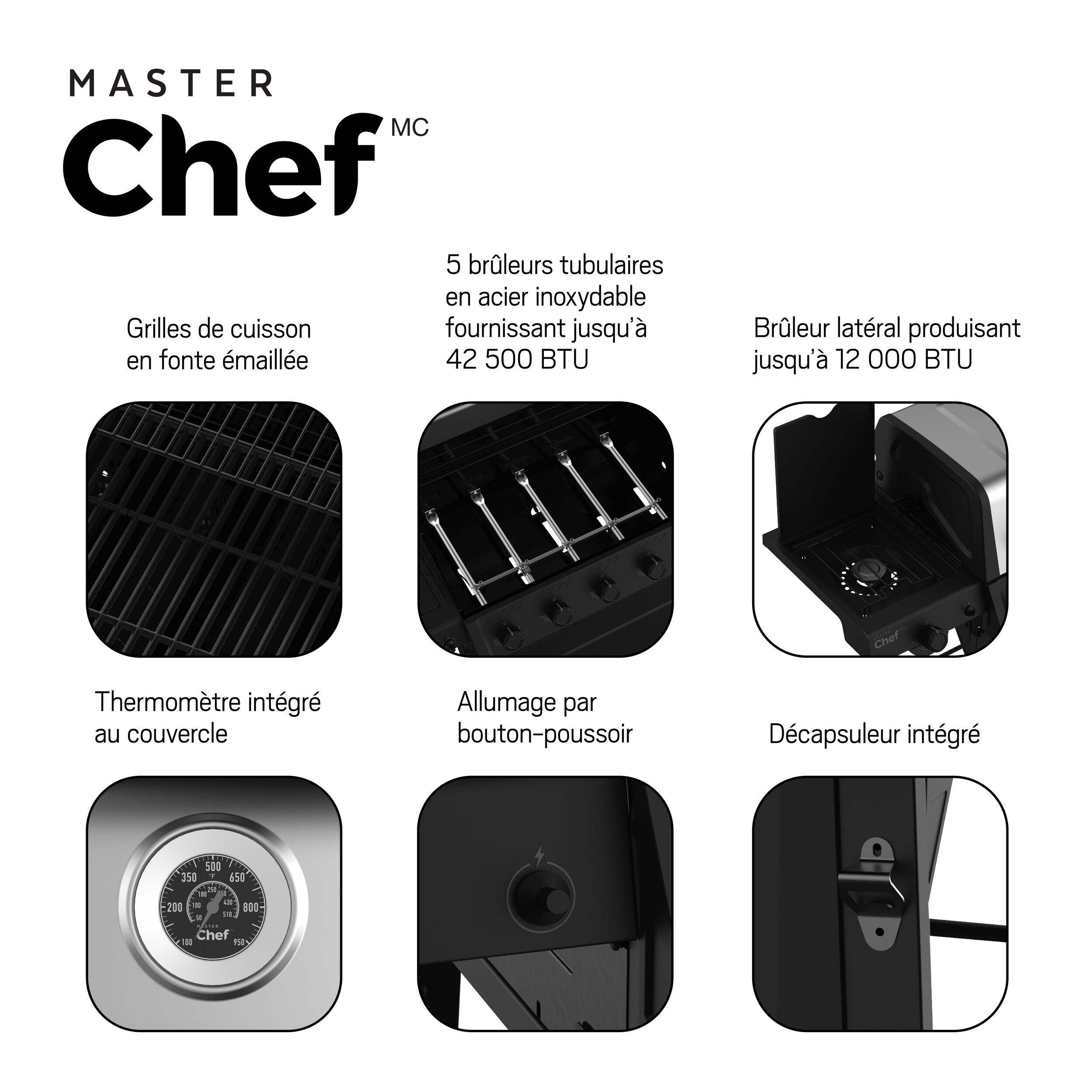 Barbecue au propane à 5 brûleurs avec brûleur latéral supplémentaire offrant une surface de cuisson totale de 680 po2