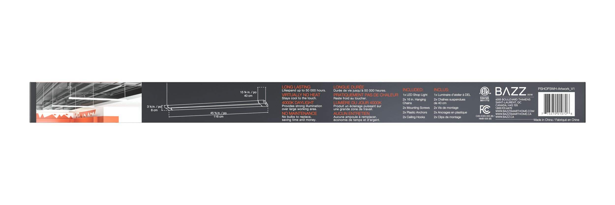 Comprend des chaînes de suspension, des vis de montage, des ancrages et des crochets de plafond