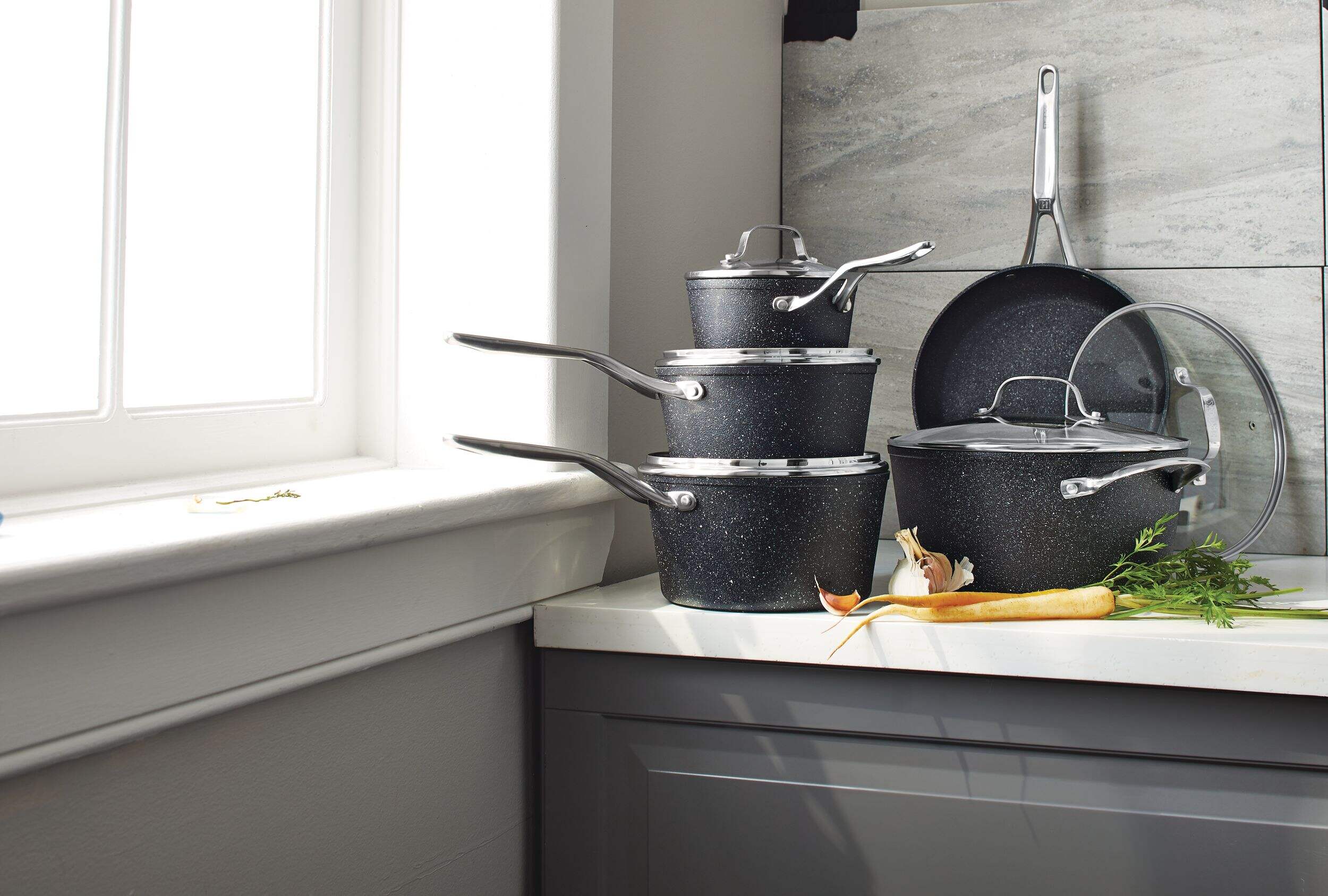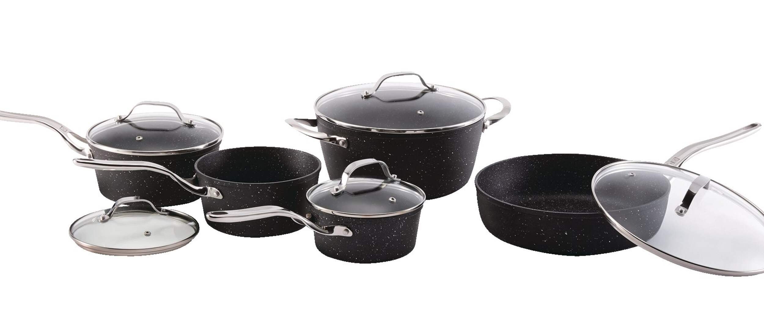 Batterie de cuisine qui comprend des couvercles en verre trempé avec évents pour une cuisson uniforme et contrôlée