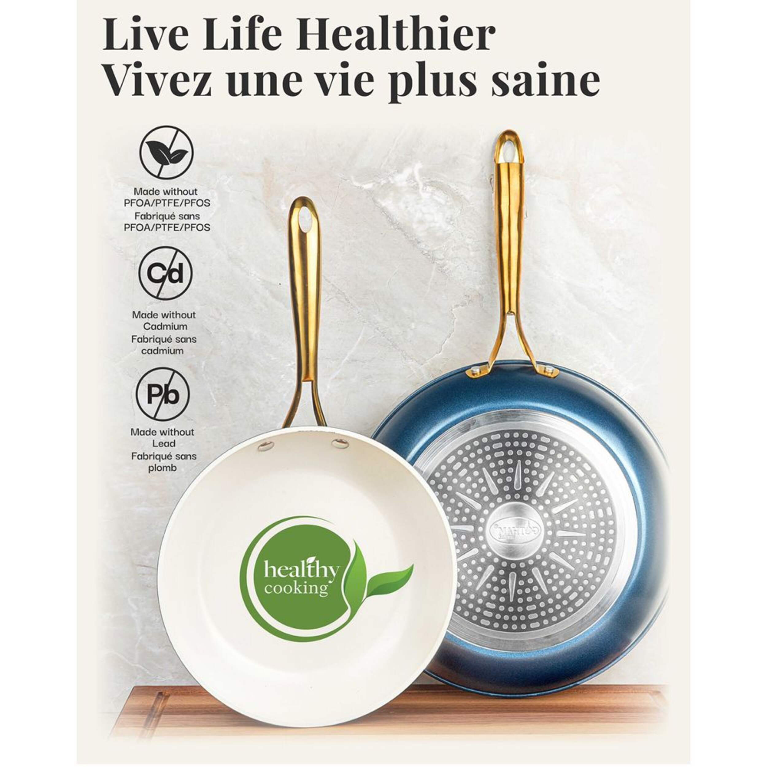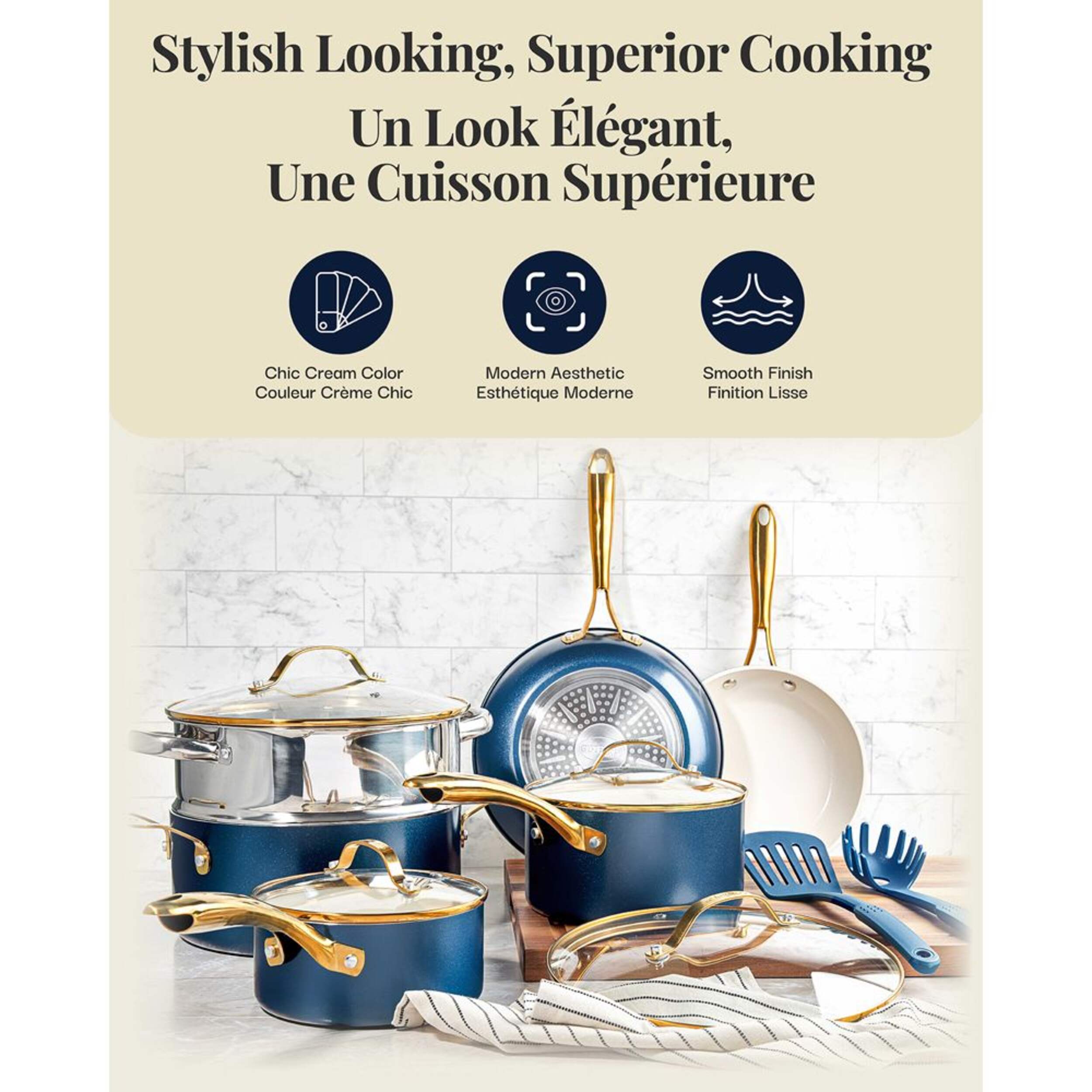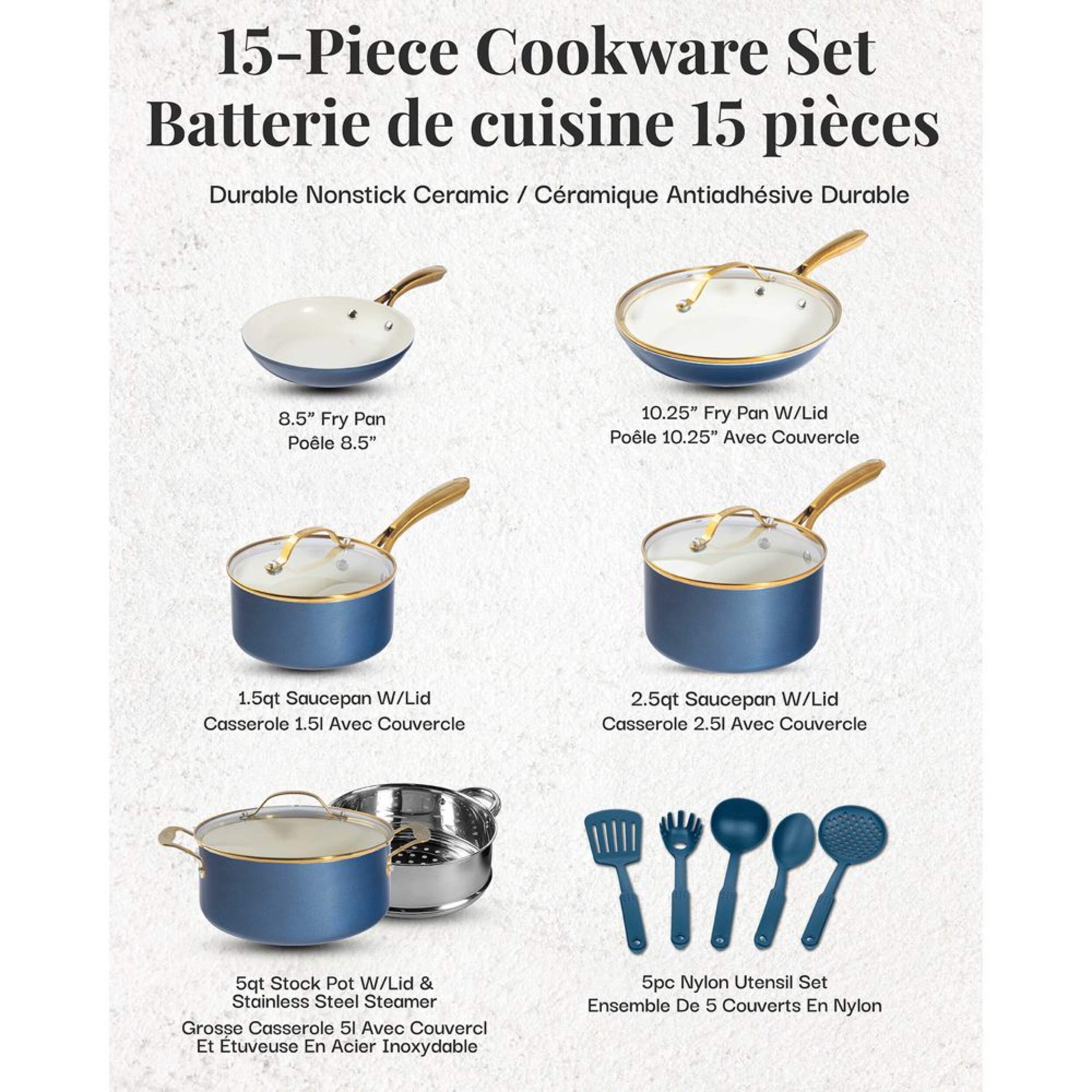 Ensemble comprenant une poêle à frire de 8,5 po, une poêle à frire de 10 po avec couvercle, une casserole de 1,5 pte avec couvercle, une casserole de 2,5 pte avec couvercle, une casserole de 5 pte avec couvercle, un panier vapeur en acier inoxydable et un ensemble d'ustensiles de cuisine de 5 pièces
