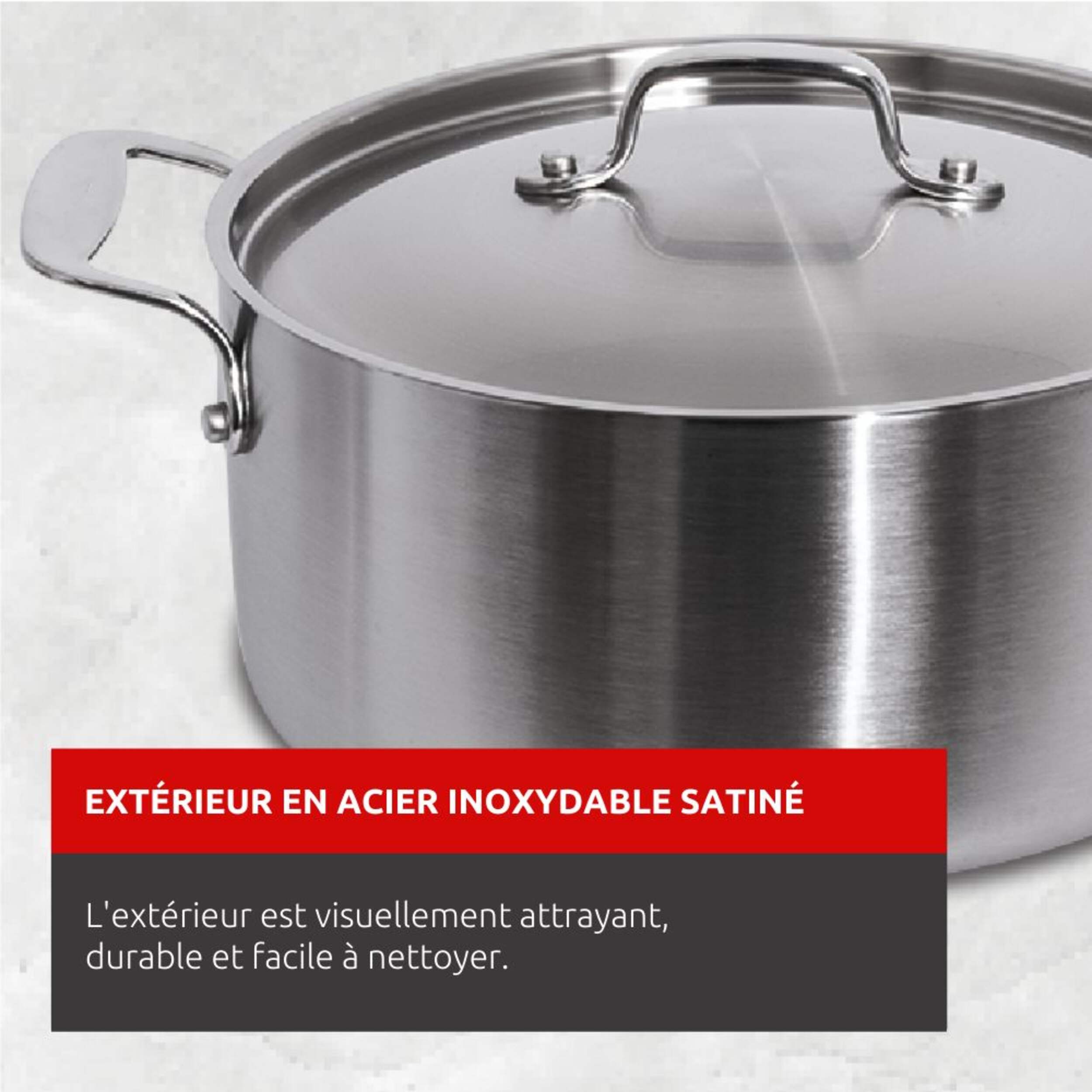 Batterie de cuisine Lagostina Commercial Clad de 12 pièces conçue pour une variété de repas, petits ou grands. Technologie à 3 épaisseurs durable qui utilise un centre en aluminium à rayonnement thermique pour répartir la chaleur dans tout le récipient et cuire les aliments. Couvercles épais qui emprisonnent la chaleur, l'humidité et les saveurs. Batterie de cuisine contemporaine en acier inoxydable dotée d'un coeur en aluminium épais diffusant la chaleur de la base jusqu'en haut des parois assurant une conductivité thermique impressionnante et des résultats culinaires uniformes.