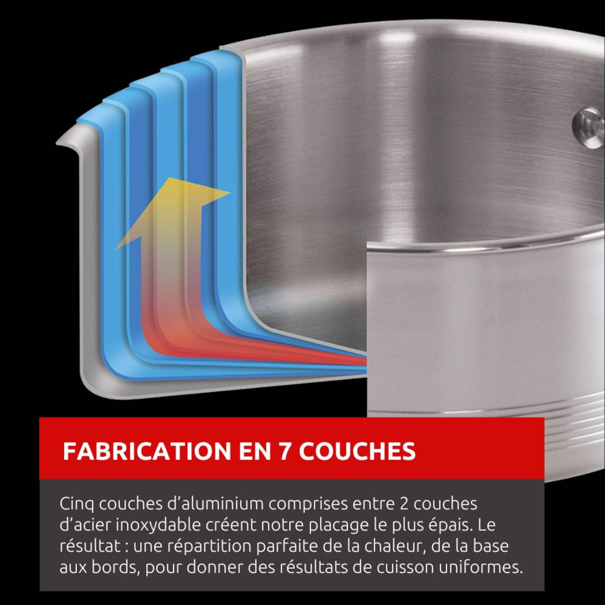 Fabriqué à partir de 5 couches d'aluminium, entre 2 couches d'acier inoxydable, créant une multicouches des plus épaisses