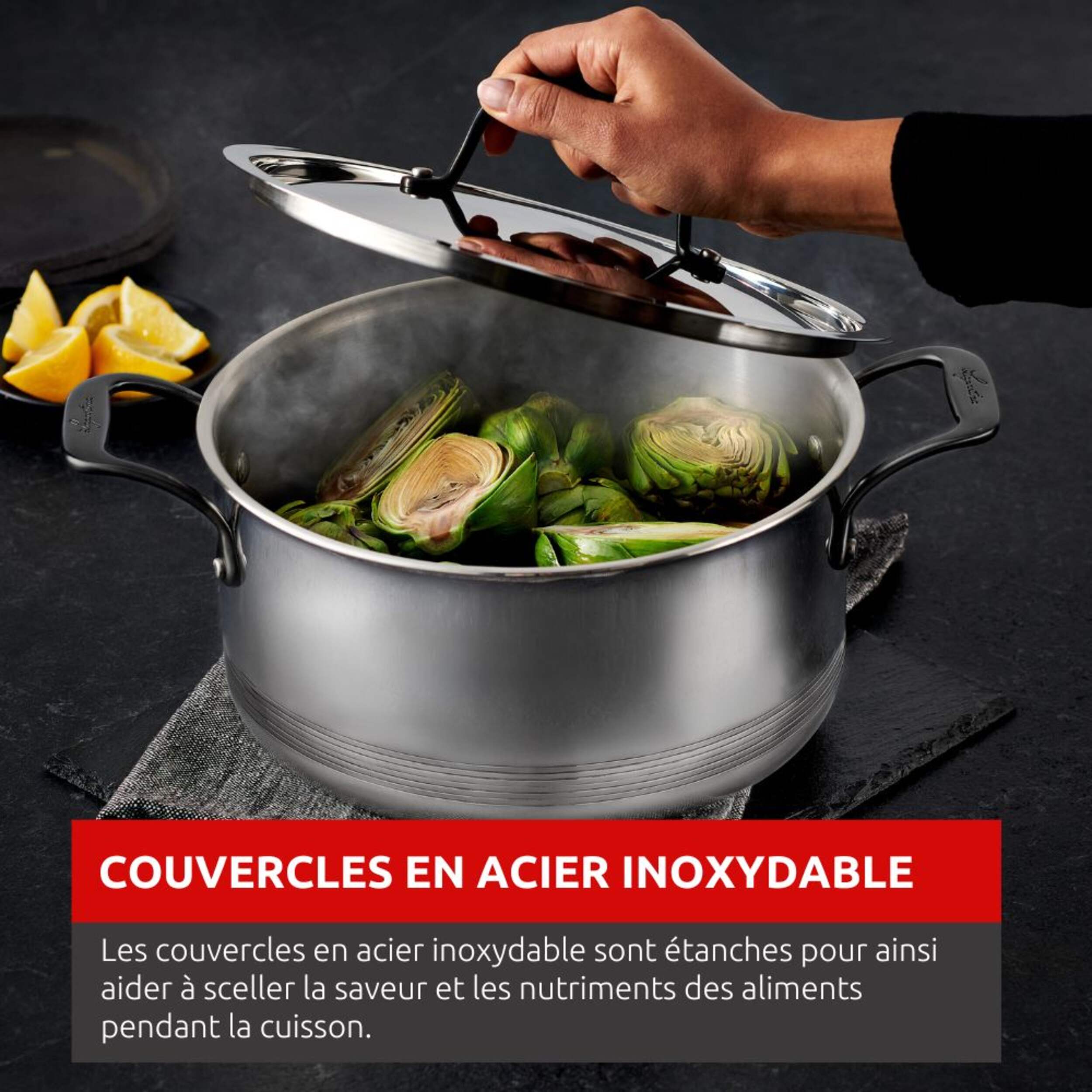 Couvercles en acier inoxydable formant un sceau étanche qui aide à conserver les saveurs et les nutriments des aliments en cuisson