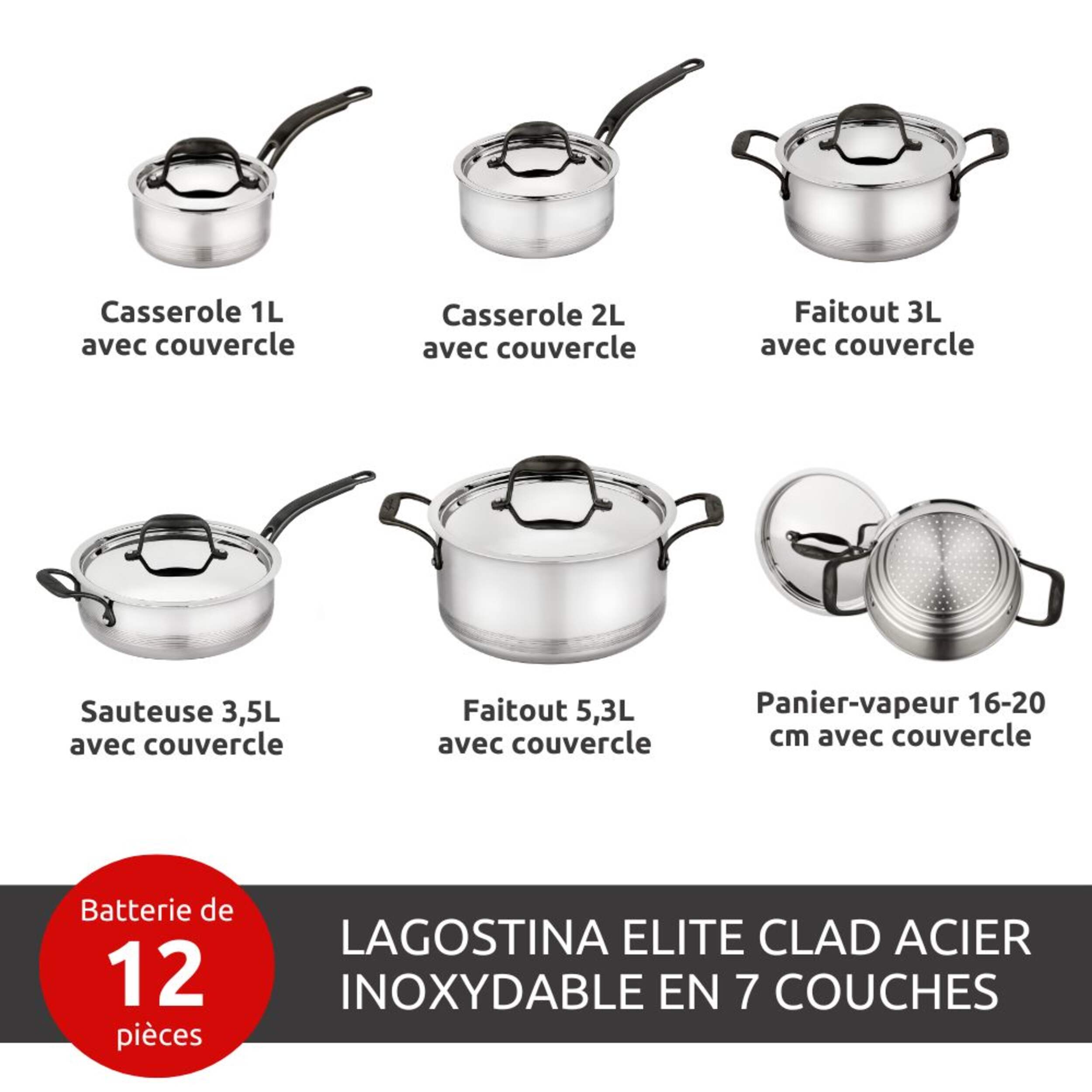 Comprend : casserole de 1 L avec couvercle, casserole de 2 L avec couvercle, casserole de 3 L avec couvercle, sauteuse de 3,5 L avec couvercle, cocotte de 5,3 L avec couvercle et étuveuse à insérer de 16-20 cm