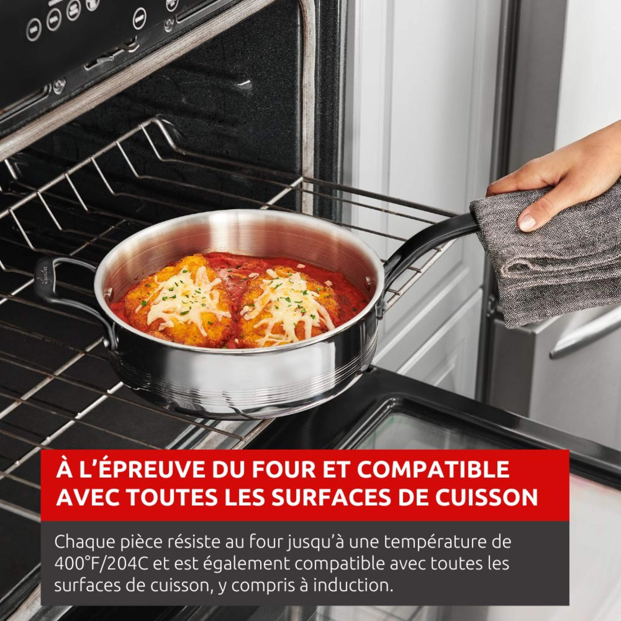 Va au four jusqu'à 204 °C (400 °F) et convient à toutes les surfaces de cuisson, y compris à induction