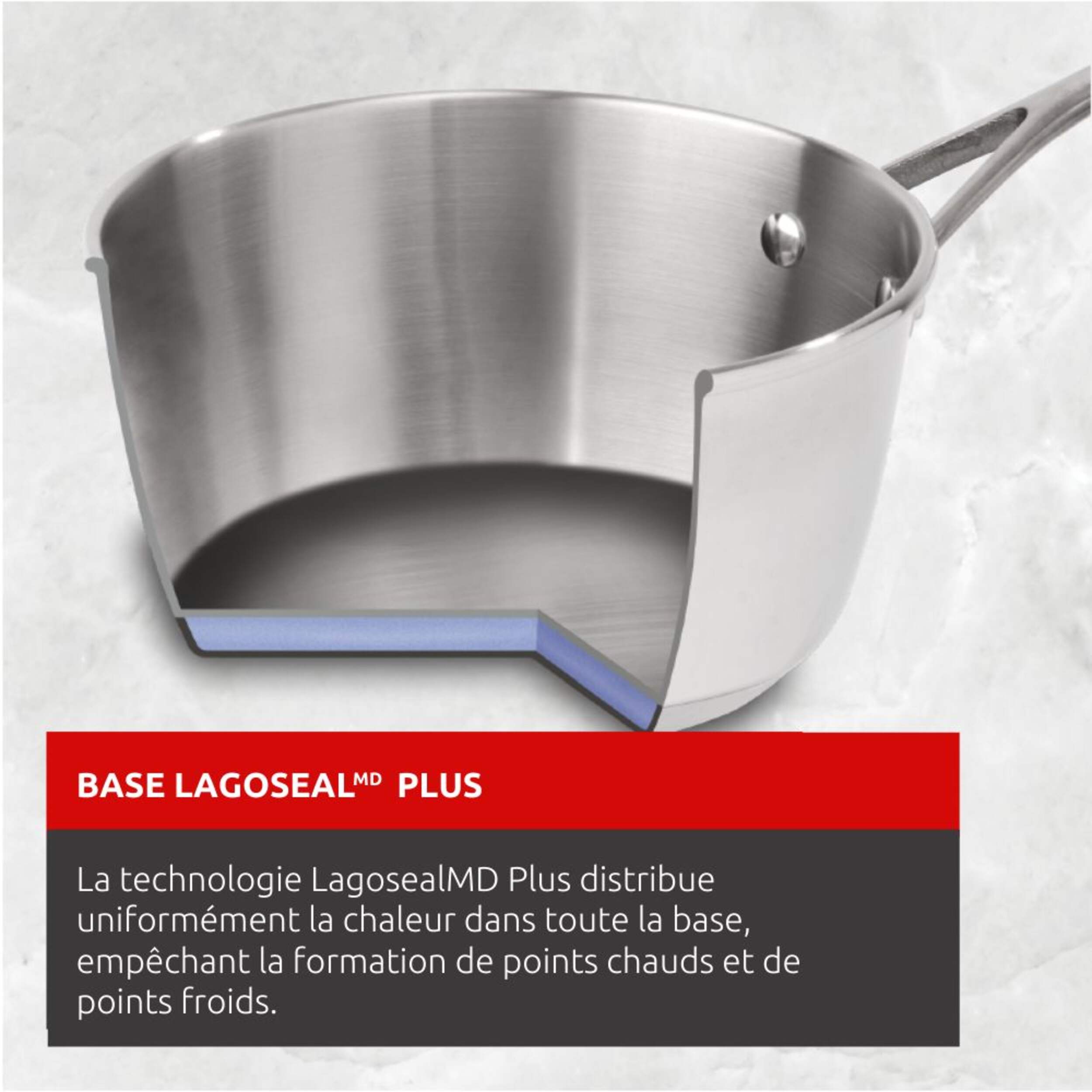 ENSEMBLE COMPLET : Comprend : Casseroles de 14 cm (1,1 L), 16 cm (1,5 L), 18 cm (2 L) et 20 cm (2,8 L) avec couvercles, un faitout de 24 cm (5,7 L) avec couvercle, un panier vapeur de plusieurs diamètres