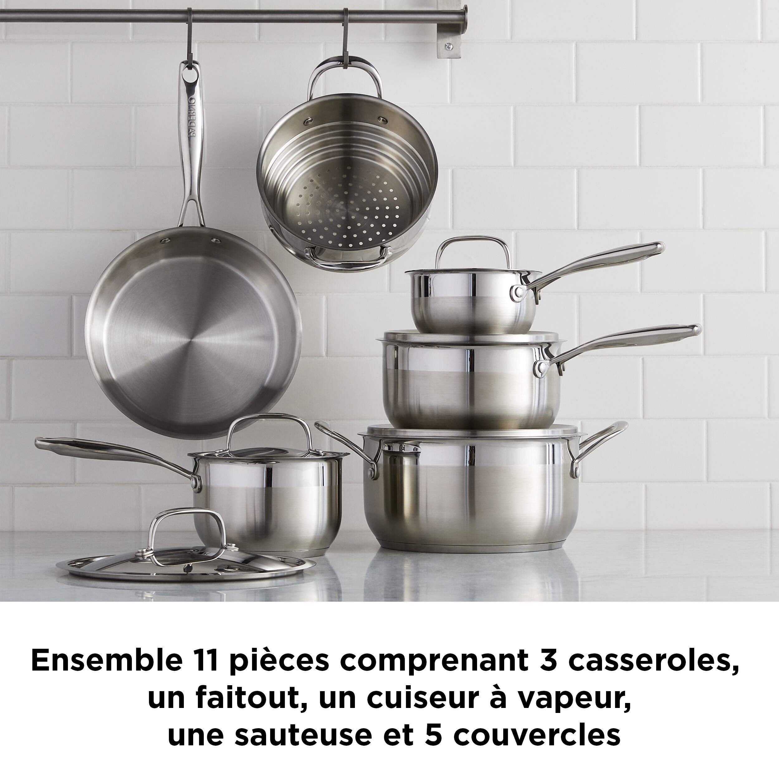 Comprend : Casseroles de 1,3 L, de 2 L et de 3 L, faitout de 5 L, plat à sauter de 2 L, cuiseur à vapeur de 2,5 L et 5 couvercles