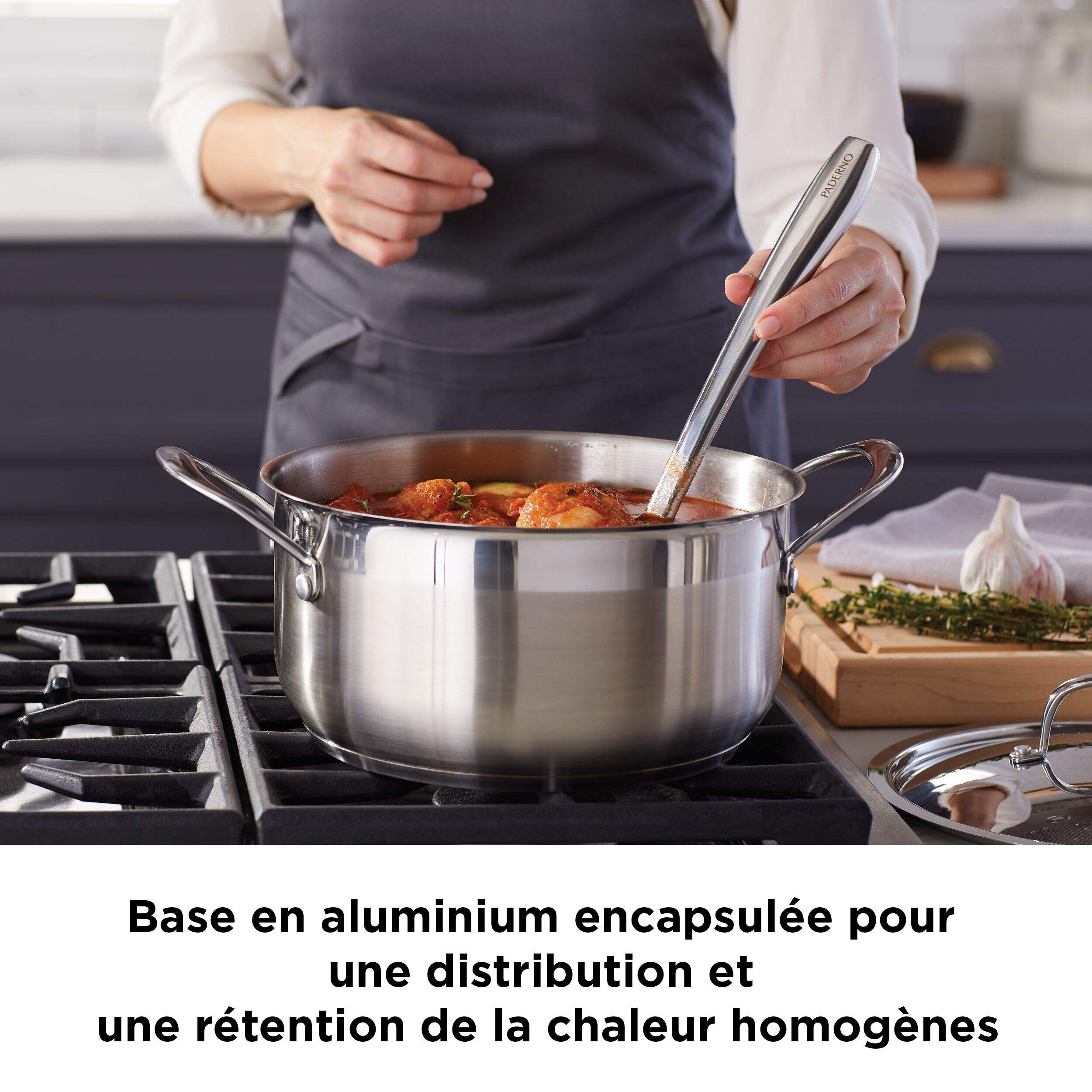 Batterie de cuisine PADERNO canadienne classique offrant polyvalence, durabilité et un rendement de cuisson optimal. Chaque pièce est fabriquée en acier inoxydable de haute qualité avec une base encapsulée en aluminium pour une distribution rapide et uniforme de la chaleur. Casseroles et poêles dotées de poignées rivetées ergonomiques pour un levage sécuritaire et de rebords évasés pour verser facilement. Batterie de cuisine de 11 pièces qui va au four, au lave-vaisselle et qui convient à toutes les cuisinières, y compris à induction.